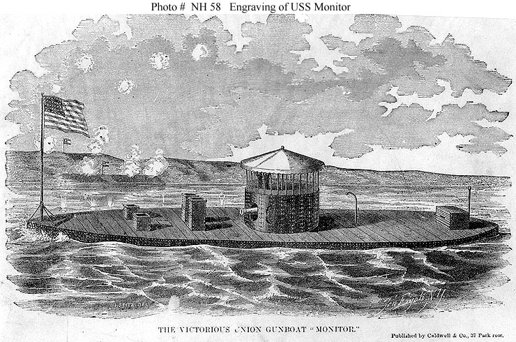 160k | Line engraving, entitled The Victorious Union Gunboat Monitor, published by Caldwell & Co., 37 Park Row, New York. Drawn by J. Seitz and engraved by Ten Eyke, it depicts the ship as she appeared before angled plating was added to the base of her pilothouse. | Courtesy of George H. Stegmann, New York. U.S. Naval Historical Center Photograph. USNHC # NH 58. | |||||||||||||||||||||||||||||||||||||||||||||||||||||||||||||||||||||||||||||||||||||||||||||||||||||||||||||||||||||||||||||||||||||||||||||