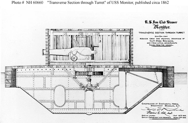 86k | Transverse hull section of the Monitor through the turret. Engraving published circa 1862, based on John Ericsson's drawings, and measurements taken from the ship. | Courtesy of the Naval Historical Foundation. U.S. Naval Historical Center Photograph. USNHC # NH 60660. | |||||||||||||||||||||||||||||||||||||||||||||||||||||||||||||||||||||||||||||||||||||||||||||||||||||||||||||||||||||||||||||||||||||||||||||