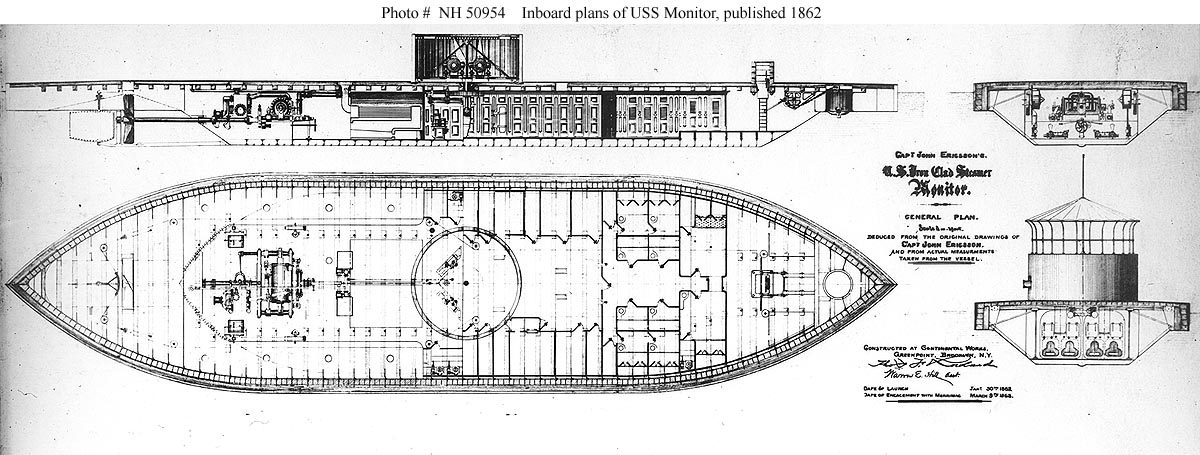 153k | General plan of the Monitor published in 1862, showing the ship's inboard profile, plan view below the upper deck and hull cross sections through the engine and boiler spaces. | Courtesy of the Naval Historical Foundation. U.S. Naval Historical Center Photograph. USNHC # NH 50954. | |||||||||||||||||||||||||||||||||||||||||||||||||||||||||||||||||||||||||||||||||||||||||||||||||||||||||||||||||||||||||||||||||||||||||||||