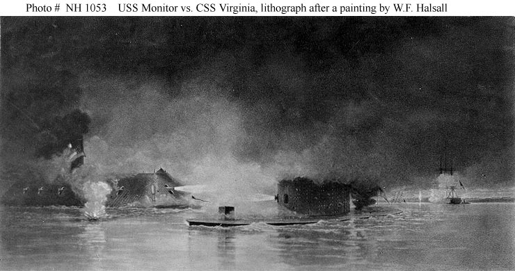 69k | Battle between Monitor & CSS Virginia in Hampton Roads, Virginia, 9 March 1862. Lithograph by Closson Blake, after a painting by W.F. Halsall, depicting the two ironclads engaging at close range. | U.S. Naval Historical Center Photograph. USNHC # NH 1053. Collection of President Franklin D. Roosevelt. | |||||||||||||||||||||||||||||||||||||||||||||||||||||||||||||||||||||||||||||||||||||||||||||||||||||||||||||||||||||||||||||||||||||||||||||