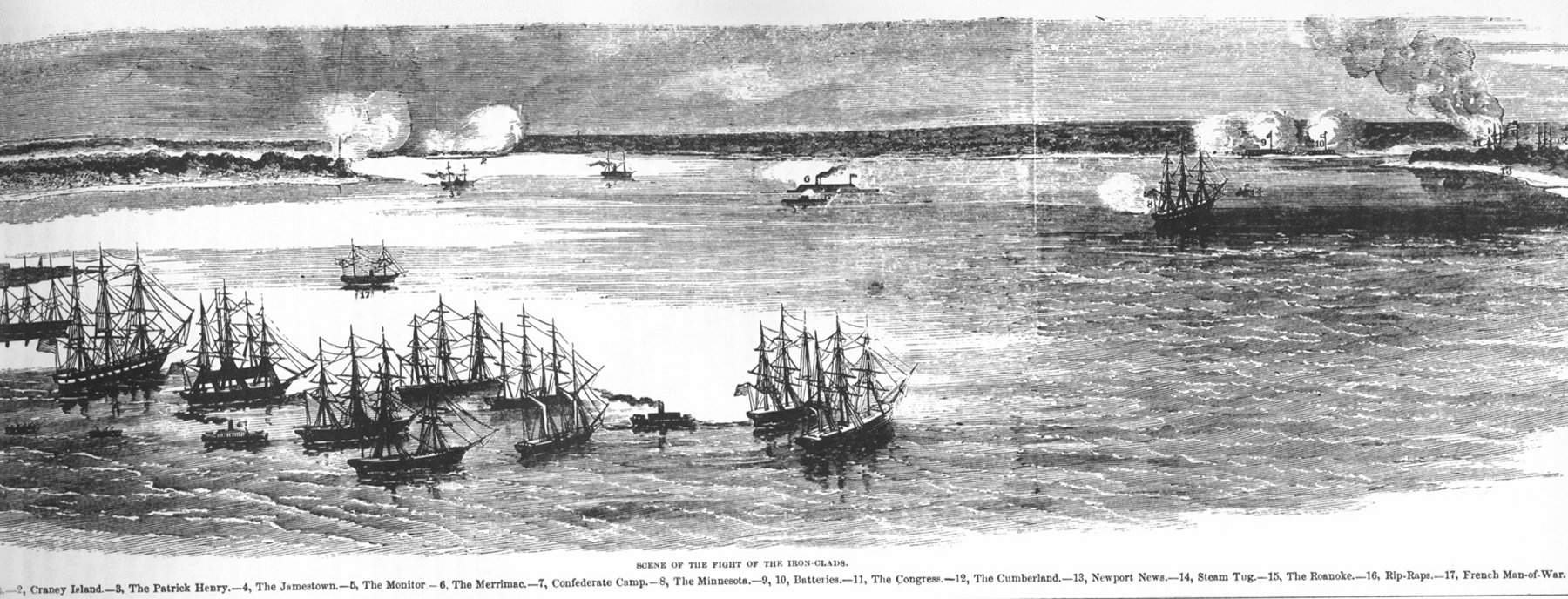 215k | "The Battle between the 'Monitor' and the 'Merrimac', in Hampton Roads, March 9, 1862". Line engraving published in Harper's Weekly January-June 1862, page 237, based on a drawing by Sergeant Charles Worret, Twentieth Regiment New York Volunteers. The view looks approximately south, from over Fortress Monroe, and provides a panoramic view of the action, with many elements keyed to text below the picture. Numbered features, as cited below the view, include: (Note: numbers 1-13 run across the upper part of the view, from left center to right): 1. Sewell's Point Battery, 30 Guns; 2. Craney Island Battery, 42 Guns; 3.CSS Yorktown 4.CSS Jamestown; 5.Monitor; 6. Merrimac; 7. Large Rebel Camp; 8.Minnesota aground; 9. Pig Point Battery; 10. Barrel Point Battery; 11. Burning of the Congress; 12. The Cumberland sunk; 13. Newport News Point and Camp; 14. St. Lorenze ... (small vessel near Minnesota); 15. Hampton; 16. Rip Raps (at far left); 17. French Man-of-War (left center); 18. Whitehall. Ships in the left foreground include Roanoke with Union transports and storeships. |