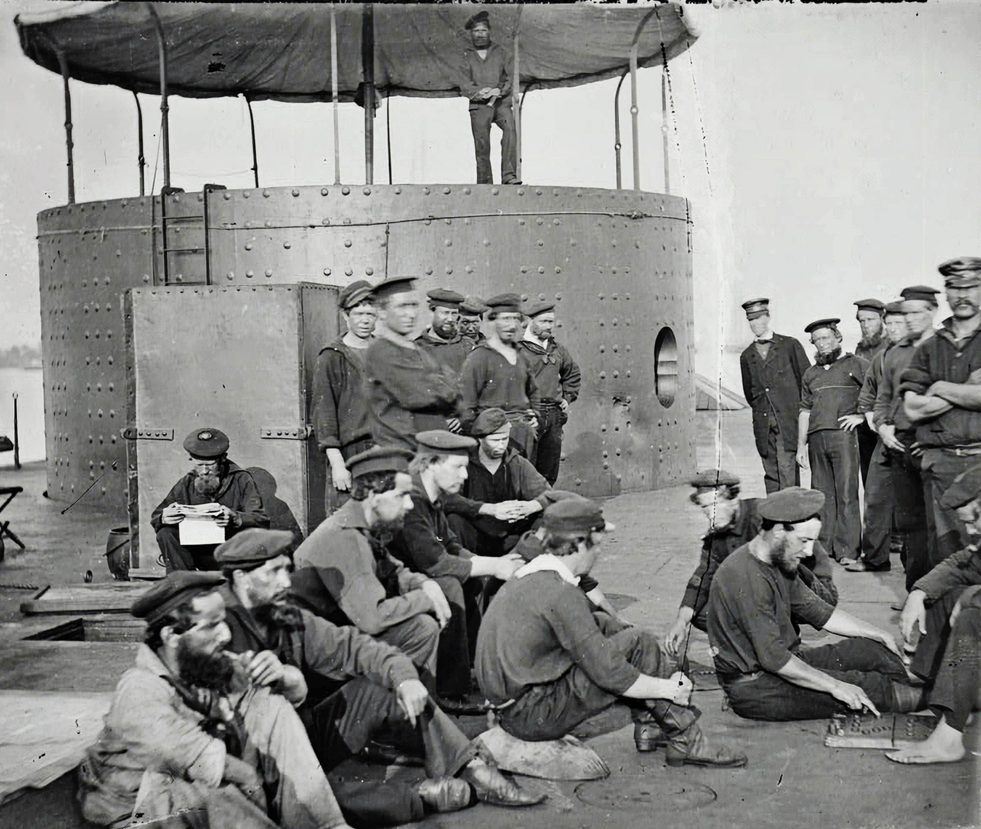 ![]() monitor1v | 1.96k | Crewmen relaxing on deck, while the ship was in the James River, Virginia, on 9 July 1862. View looks forward on the starboard side, with the gun turret beyond. Note men playing checkers at right. Another man is reading a newspaper by the starboard smokestack | U.S. Naval Historical Center Photograph. USNHC # 574 via Robert Canchola. | |||||||||||||||||||||||||||||||||||||||||||||||||||||||||||||||||||||||||||||||||||||||||||||||||||||||||||||||||||||||||||||||||||||||||||||