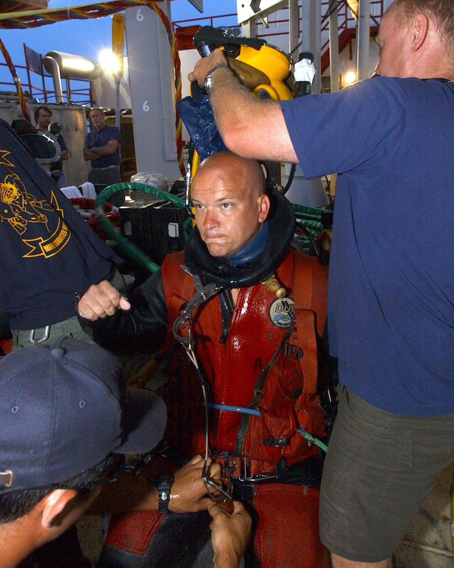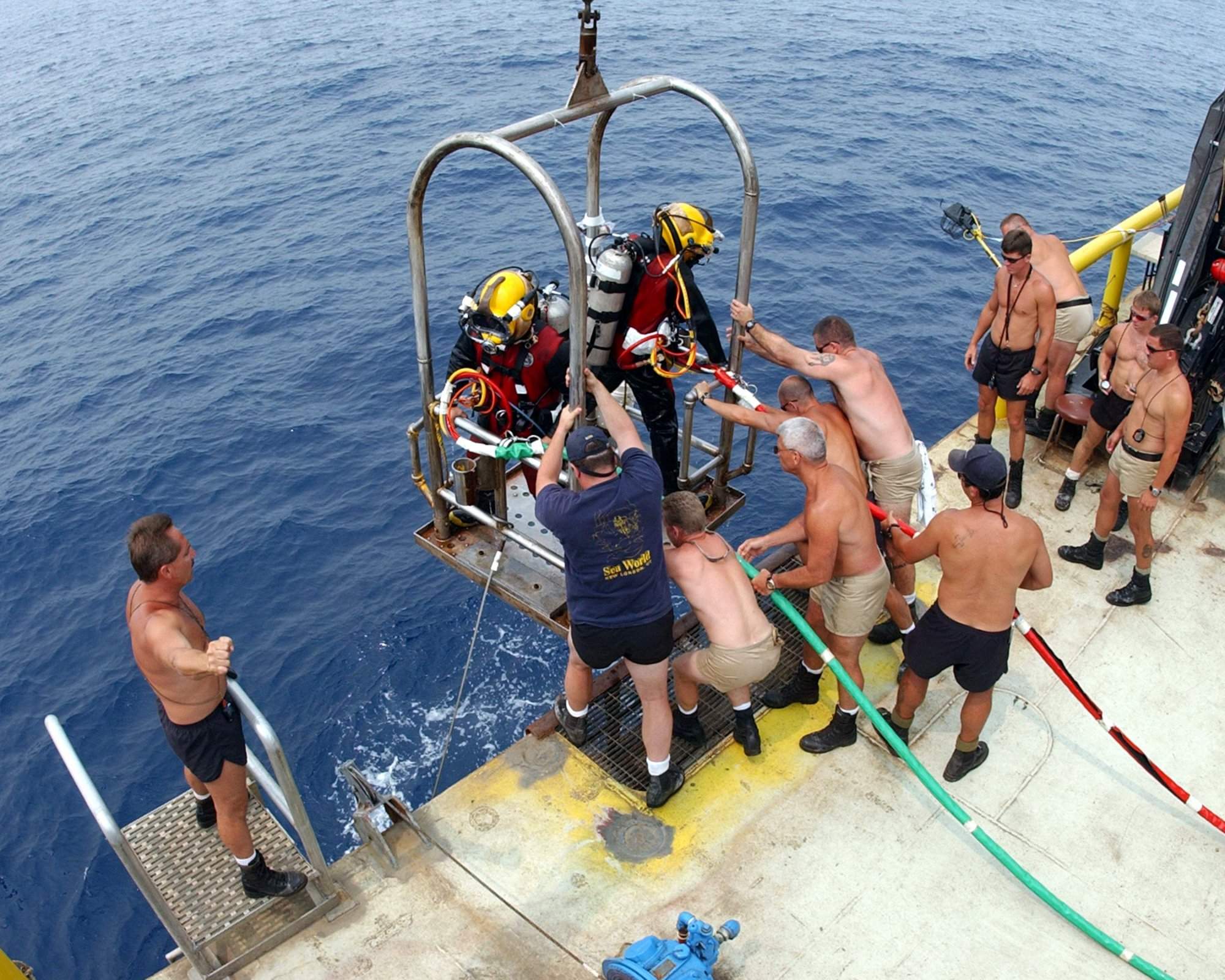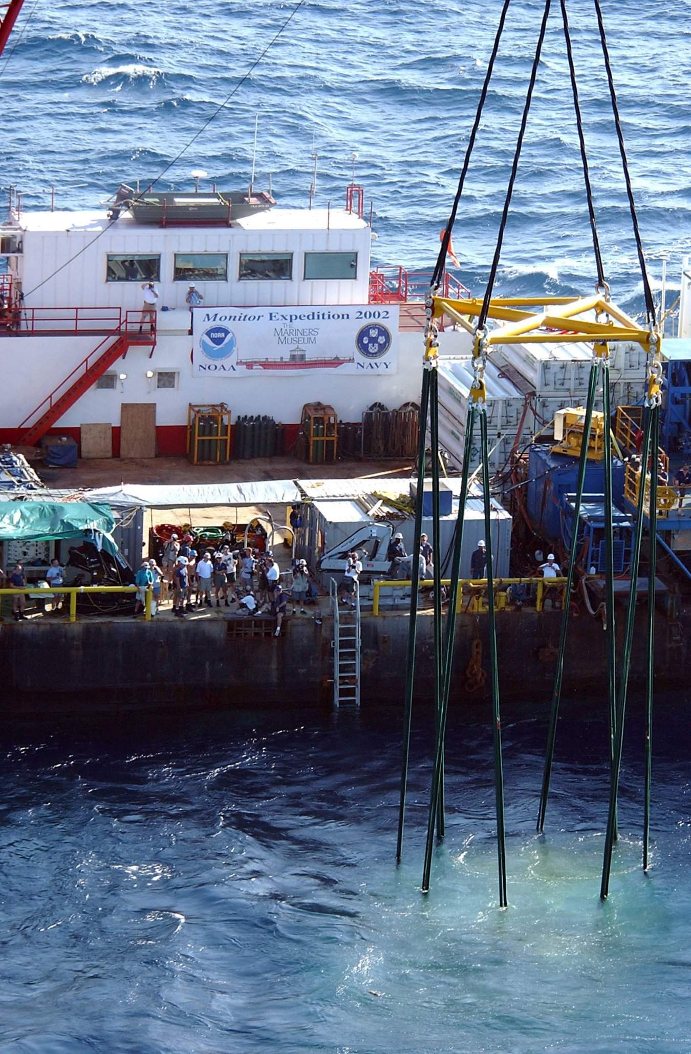 Atlantic Ocean, 1 July 2002, Senior Chief Boatswain's Mate Jim Mariano (far left) gives instructions to the winch operator as divers are "swung-in" during the "up-and-over" phase of a dive on the sunken Civil War ironclad, Monitor. Monitor rests 240 feet below the ocean's surface. Diving operations are designed to prepare the 22 foot diameter turret and 11-inch Dahlgren guns for salvage and recovery. |
