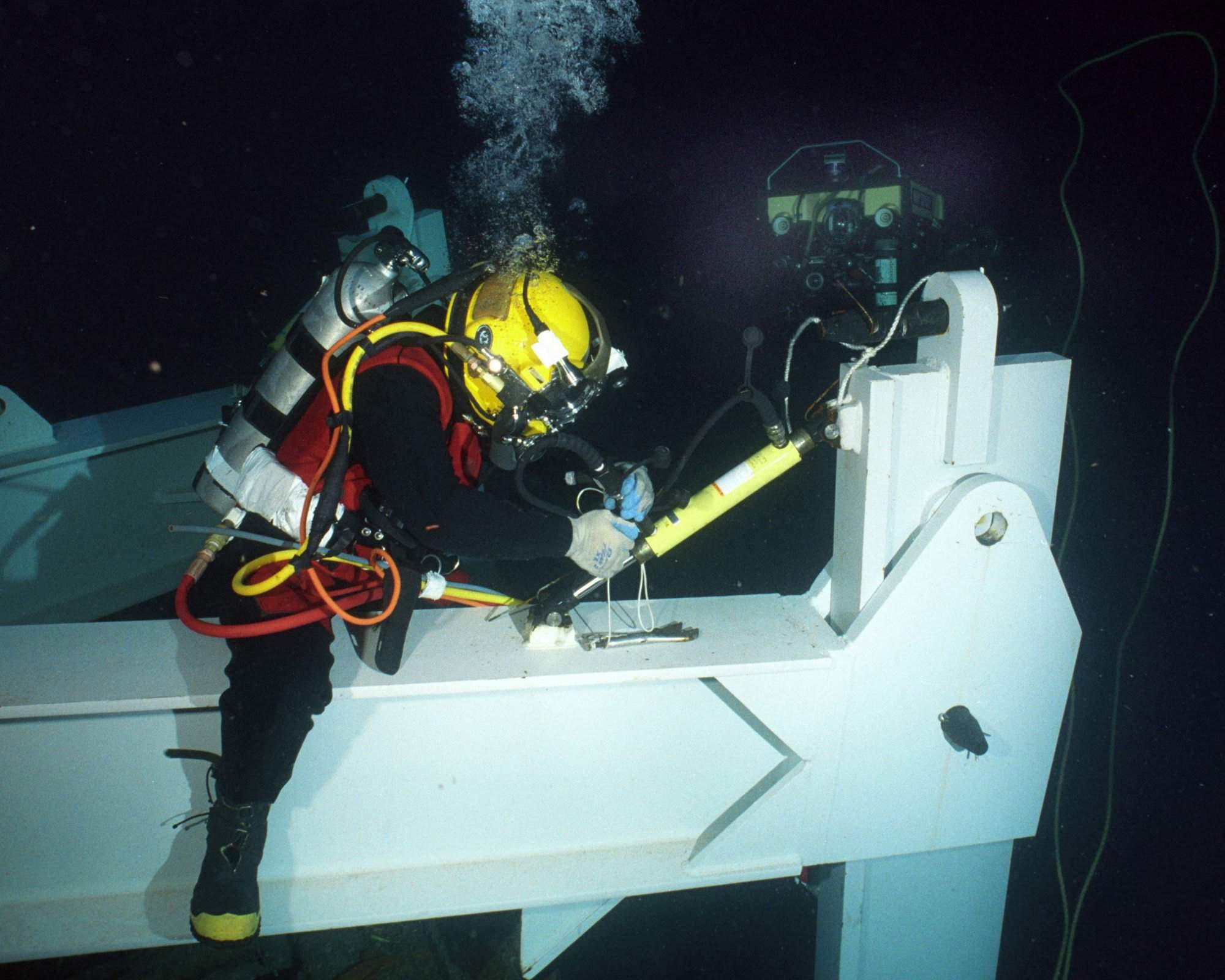 At sea off the coast of Cape Hateras, N.C. on 21 July 2002, Hull Technician 1st Class John Coffelt works on a hydraulic ram as a remote operated vehicle (ROV) looks on during a dive on the sunken Civil War Ironclad, Monitor, which rests 230 feet below the ocean's surface. The ram will be used to articulate a leg of the "spider" apparatus that will lift the turret. |