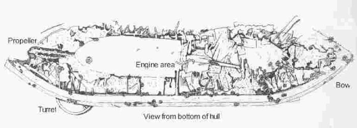 Sketch of the ship's remains: Monitor lies upside down, in badly damaged condition, off Cape Hatteras, North Carolina. In this image, her bow is to the right, with her turret displaced and visible in the lower left, with the hull resting atop it.