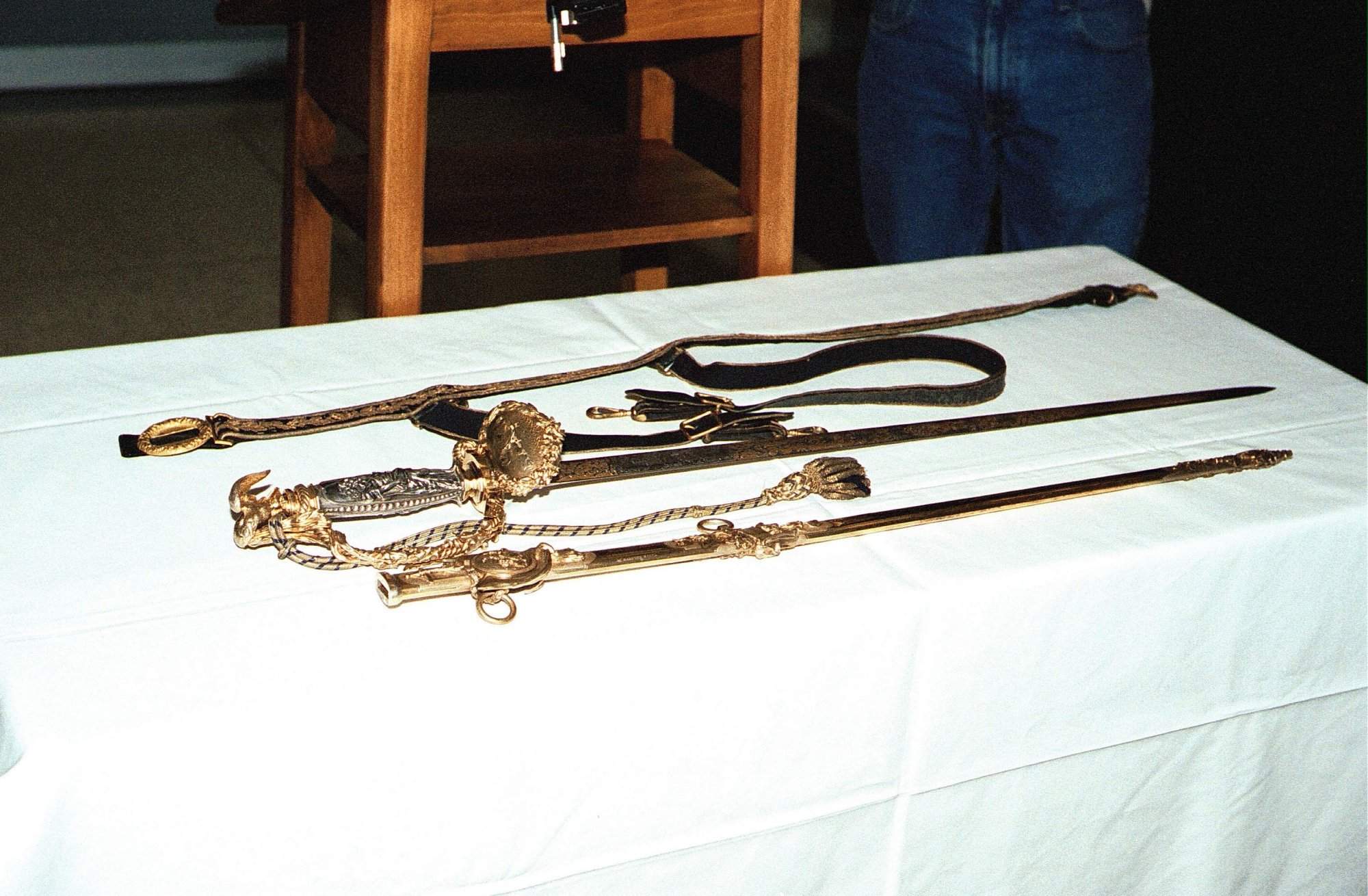 The historic Worden Sword rests on a table with its belt and scabbard laid out for display. The FBI recovered the priceless sword missing since 1931, and returned it to the U.S. Naval Academy at a press conference at Annapolis, Md., 12 January 2004. The Tiffany sword was originally presented to Rear Adm. John L. Worden by the state of New York for his command of Monitor in its famous battle with Virginia in Hampton Roads, Va., 9 March 1862. Rear Adm. Worden also served as the seventh Superintendent of the U.S. Naval Academy. |
