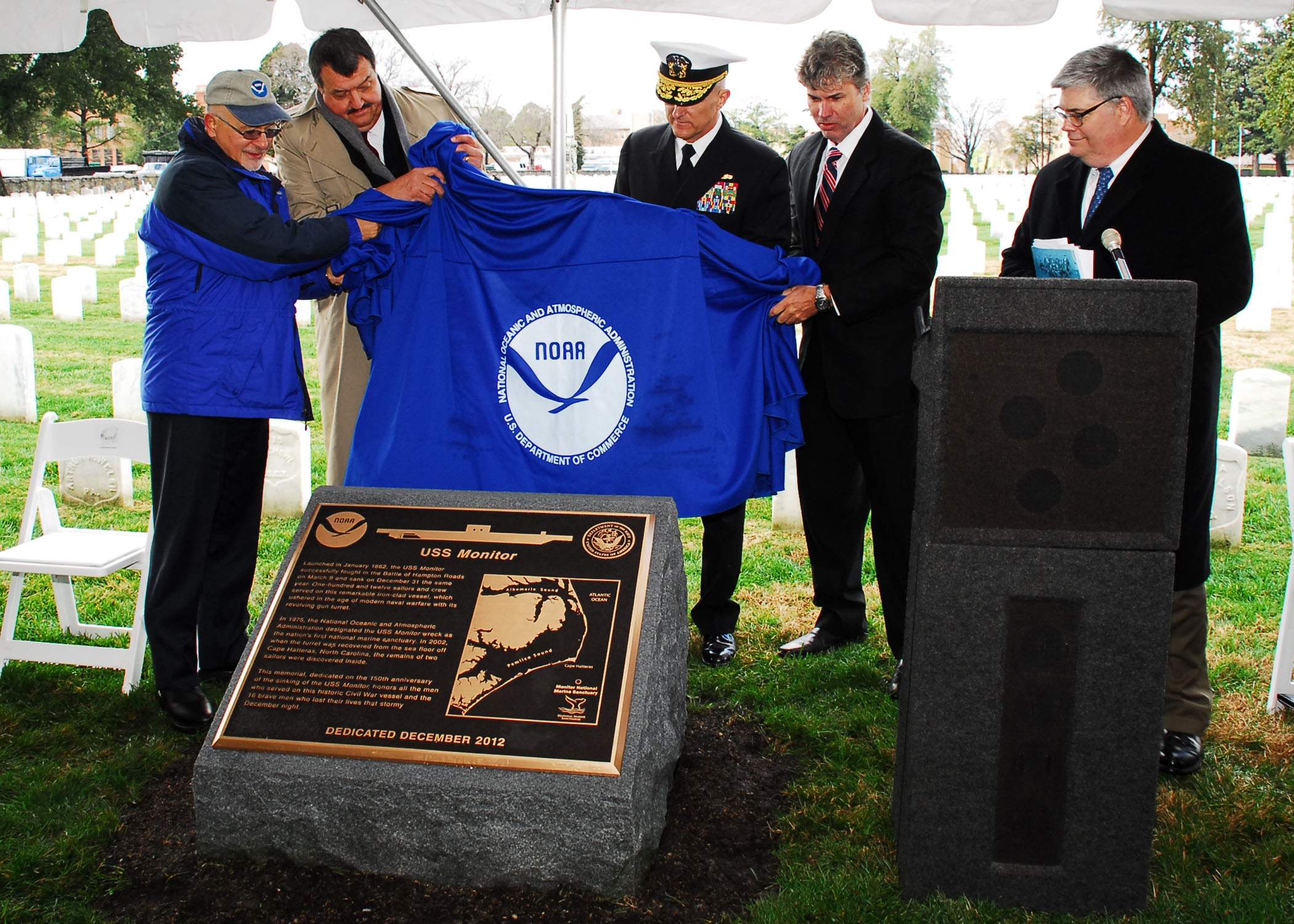 The memorial monument for Monitor is revealed at the Hampton National Cemetery. 31 December 2012 marks the 150th anniversary of the sinking of the Monitor which foundered during extreme weather off the coast of Cape Hatteras. |