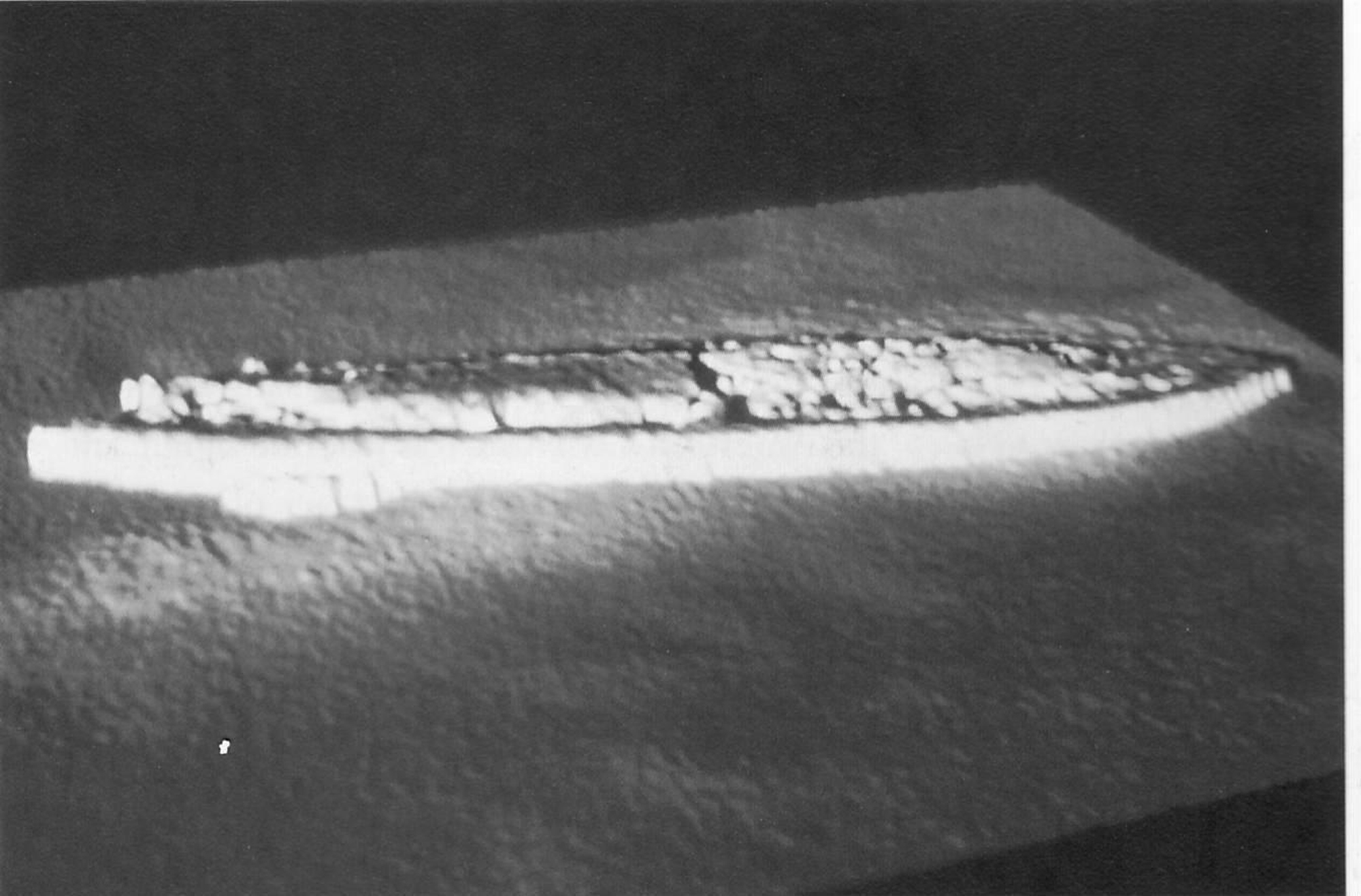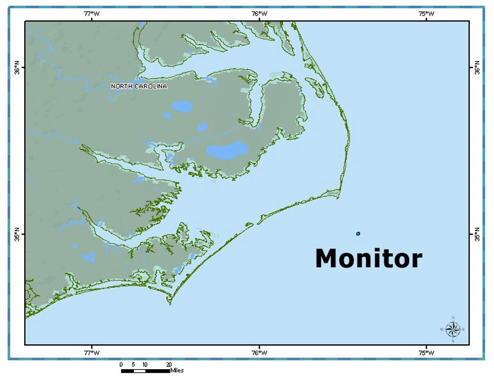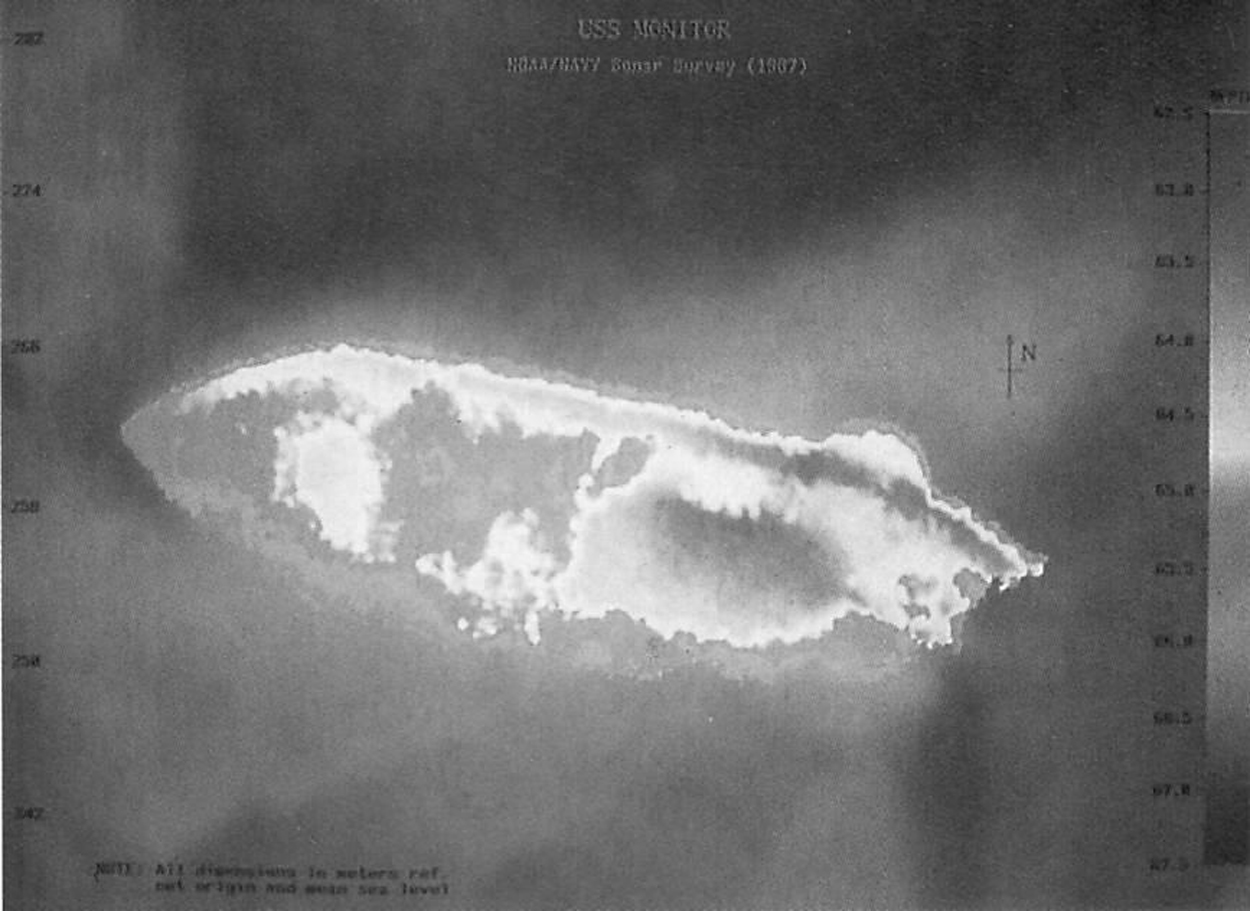 Monitor lies upside down, in badly damaged condition, off Cape Hatteras, North Carolina. In this image, her bow is to the right, with her turret displaced and visible in the lower left, with the hull resting atop it.