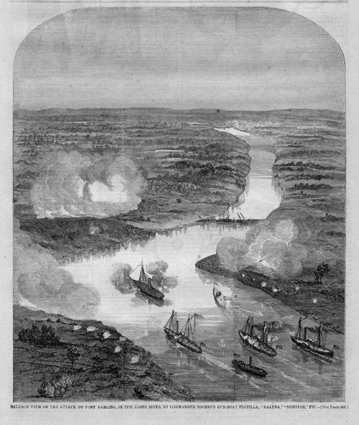 873k | Civil War wood-cut engraving/print is titled "BALLOON VIEW OF THE ATTACK ON FORT DARLING, IN THE JAMES RIVER, BY COMMANDER ROGERS'S GUN-BOAT FLOTILLA, GALENA, MONITOR, ETC.", published in Harper's Weekly, May 1862. | Photo courtesy of Tommy Trampp. | |||||||||||||||||||||||||||||||||||||||||||||||||||||||||||||||||||||||||||||||||||||||||||||||||||||||||||||||||||||||||||||||||||||||||||||