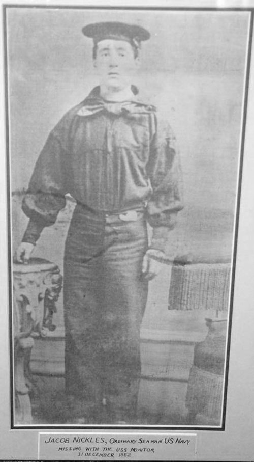 127k | Missing from the sinking of Monitor Acting Ensign Norman Atwater Acting Ensign George Frederickson was last seen manning the pumps in an attempt to keep the Monitor afloat. Third Assistant Engineer Robinson W. Hands was probably in the engine room along with Third Assistant Engineer Samuel A. Lewis; First-Class Fireman Thomas Joice; First-Class Robert Williams; and Coal Heaver George Littlefield. All were lost. Boatswain's Mate Wells Wentz (shipped out as John Stocking, a name he picked from a Reverend who lived in his town in Binghamton, a common practice among enlisted in they decided to desert the navy) served with the Monitor during her historic engagement with the Virginia, and was on board the ill-fated iron clad when she was being towed south by the Rhode Island. When the Monitor foundered during a force gail storm, on the night of 31 December 1862, Wentz volunteered to go forward and attempt to cut through the heavy hawser connecting her to the Rhode Island. He was swept overboard and drowned, becoming one of the sixteen officers and men lost with the historic iron clad. He was transferred from the Sabine to the Monitor on 6 March 1862 just prior to her encounter with the Virginia. Wells Wentz was born in Binghamton N.Y. 18 August 1830. Quarter Gunner James Fenwick Yeoman William Bryan Officer's Steward Daniel Moore Officer's Cook Robert Howard Landsman William Allen Landsman William Eagan Ordinary Seaman Jacob Nickles First-Class Boy Robert Cook |