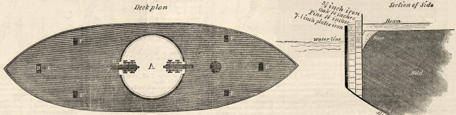 225k | THE ERICSSON STEEL-PLATED BATTERY. THE ERICSSON BATTERY, a sketch of which will be found on this page, is now in process of construction at the Continental Iron Works at Green Point, Long Island. She will be launched in the course of a few days. She is about 200 feet in length, with 86 feet beam and 11 feet depth of hold. Her hull is built of iron, and to protect her sides she is covered with a layer of oak 14 inches in thickness, another layer of pine 14 inches in thickness, the whole being plated with seven plates of one inch iron, making her shot-proof. A revolving fort, which contains two 12-inch guns, is placed upon the deck near the centre. This fort, or bomb-proof, is eight inches in thickness. The diameter of the fort is 20 feet inside, and it is 10 feet in height. She will be propelled by a powerful Ericsson engine. She is one of the most novel and interesting pieces of naval architecture constructed in this country. For proper reasons we forbear to give very full details in relation to this vessel, as we do not desire to give the rebels any information on such matters. Other iron-clad vessels are being built at Philadelphia, Pennsylvania, and Mystic, Connecticut. By next summer we shall have several afloat. |
