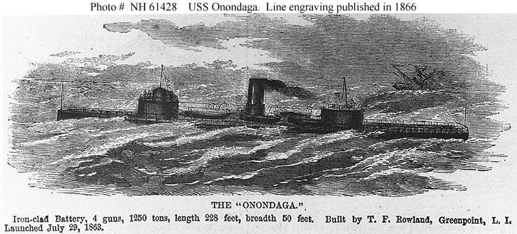 66k | Engraving of the Onondaga published in "Harper's Weekly", 3 February 1866 as part of a larger print entitled "The Iron-clad Navy of the United States. | U.S. Naval Historical Center Photograph # NH 61428. | |