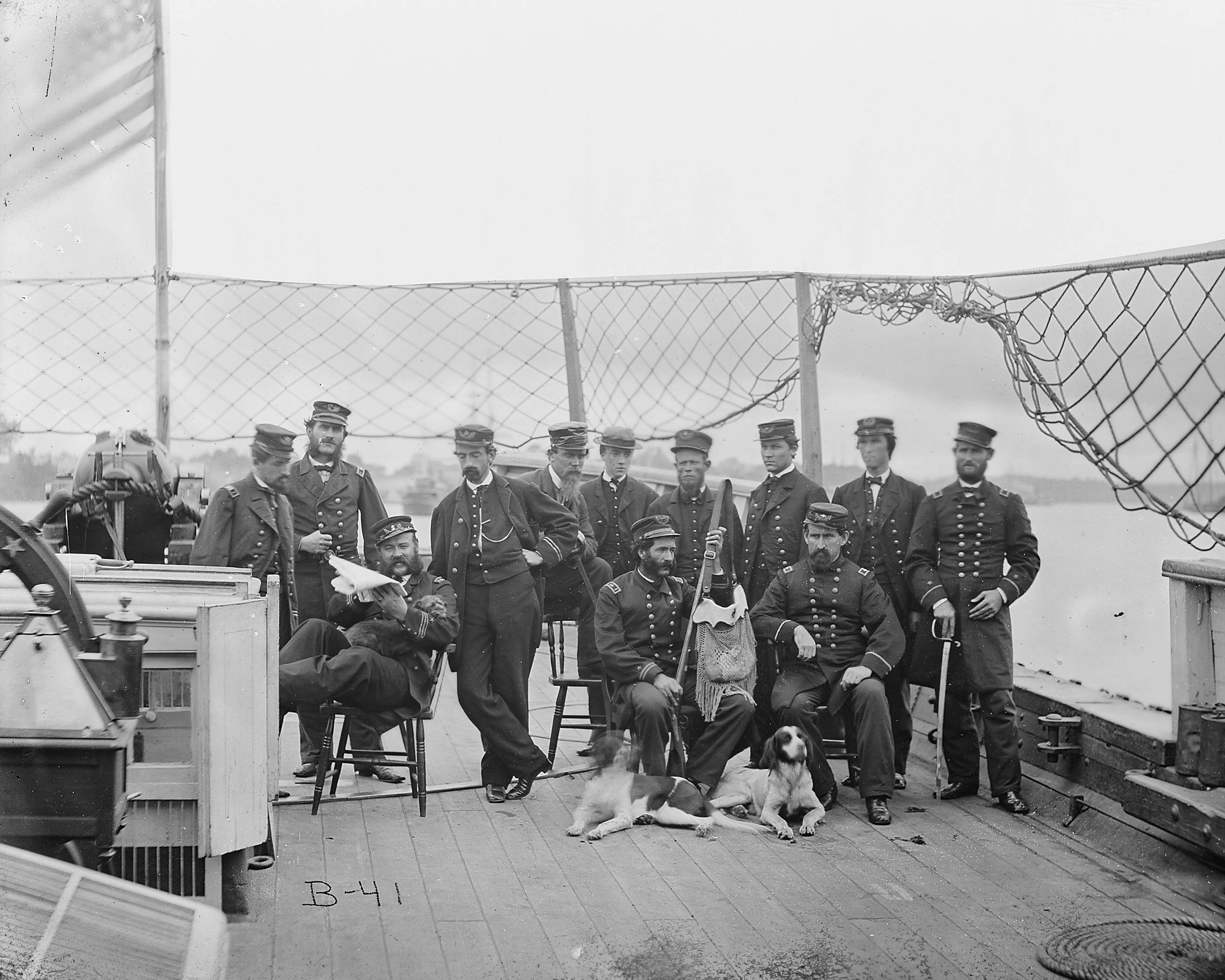 506k | The officers gathered on deck of the Onondaga. Image taken on the James River, Virginia, in 1864-65. | Image # 524460a from the National Archives at College Park, (NARA) courtesy of Bill Gonyo. | |