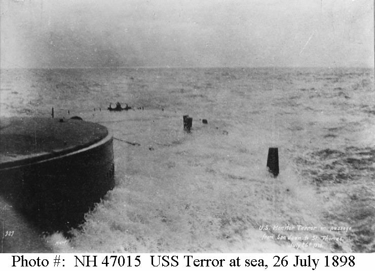 57k | View of the Terror (M-4) looking forward with her forecastle awash, while steaming from San Juan, Puerto Rico, to St. Thomas, Virgin Islands, 26 July 1898. | U.S. Naval Historical Center Photograph # NH 47015. | |