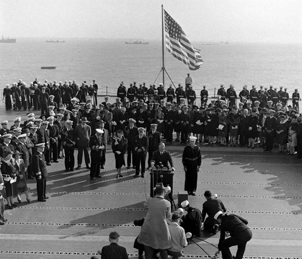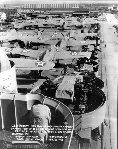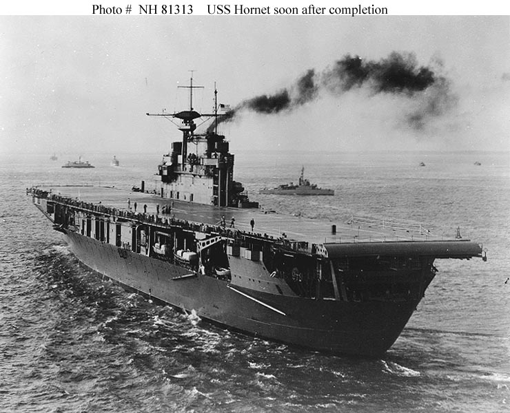 317k | Starboard bow view of USS Hornet (CV-8), 20 October 1941, at Norfolk Navy Base, the day of her commissioning. Life Magazine Archives, Thomas McAvoy photographer, shared by Peter DeForest. |