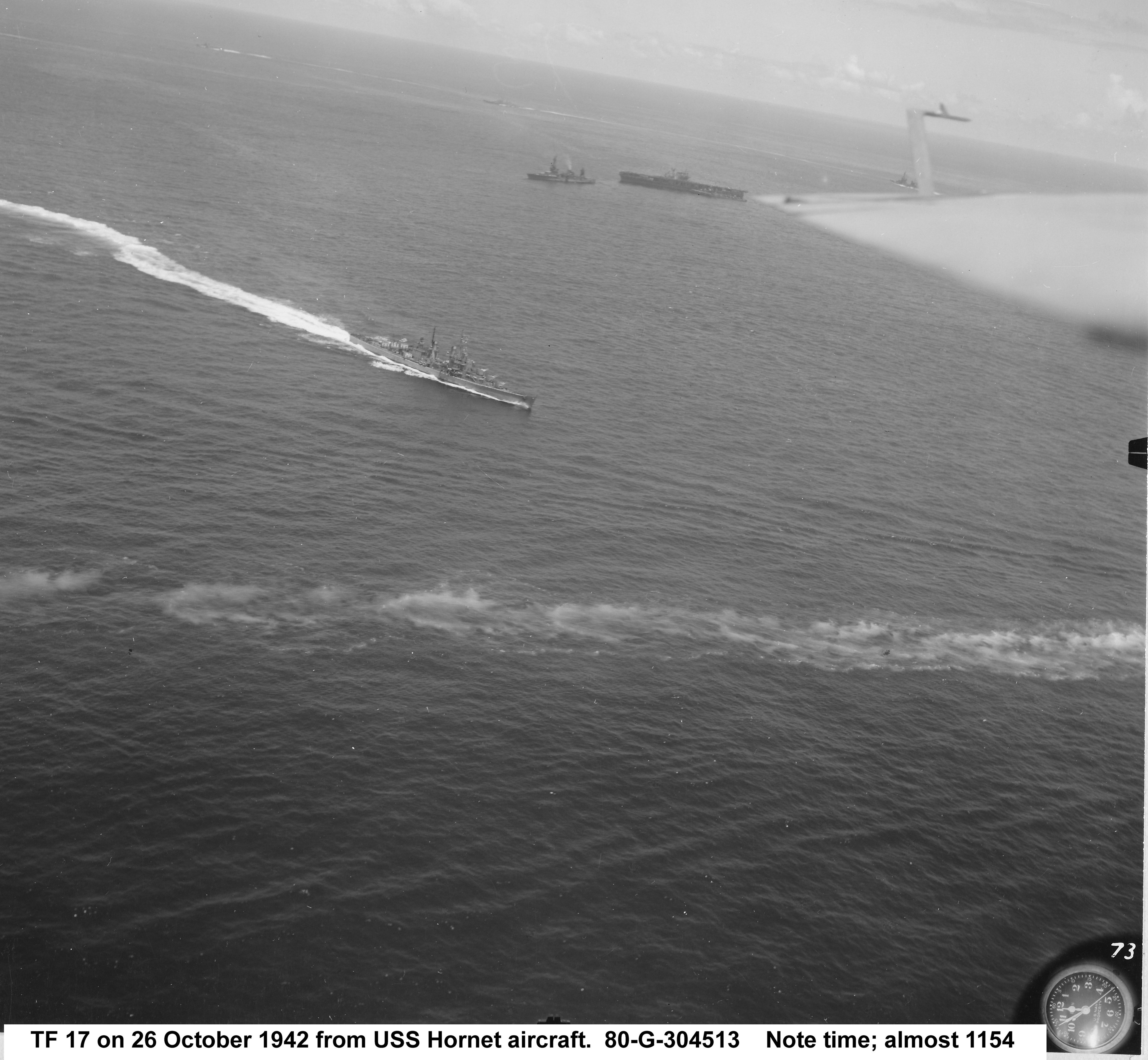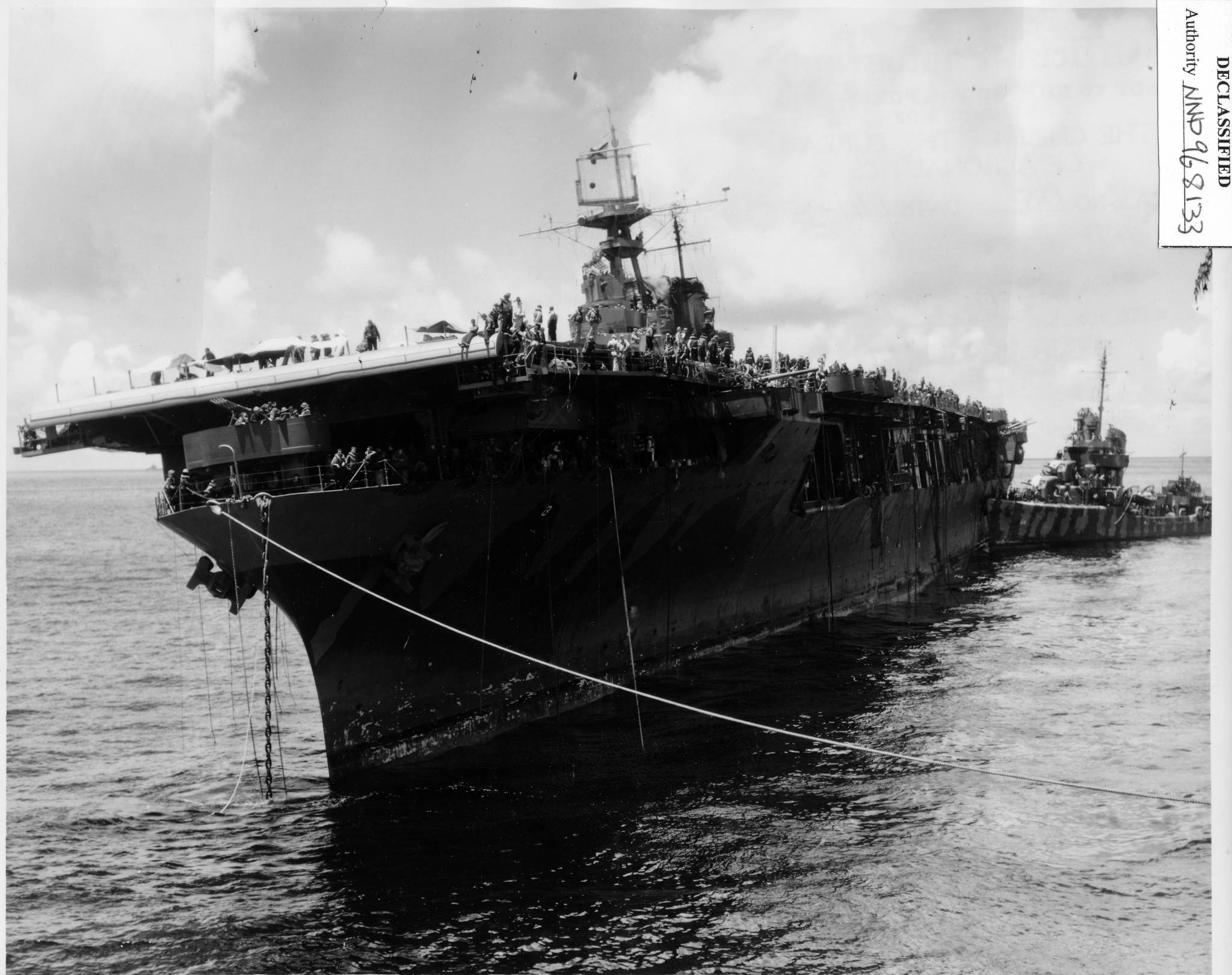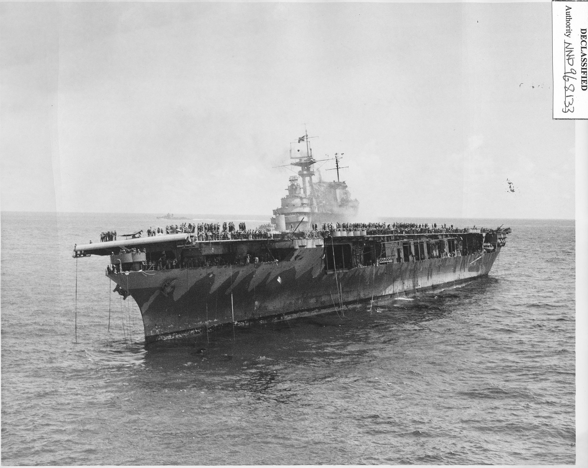 316k | October 26 1942, Hornet in tow. Cruiser Northampton (CA-26) made three attempts to take the carrier in tow, but additional Japanese attacks frustrated these efforts. The "X" above the bridge and the CXAM radar antenna indicates where T.R. Archer was wounded by a Japanese dive bomber in a suicide attack (see photos "020808" and "020809", above). |