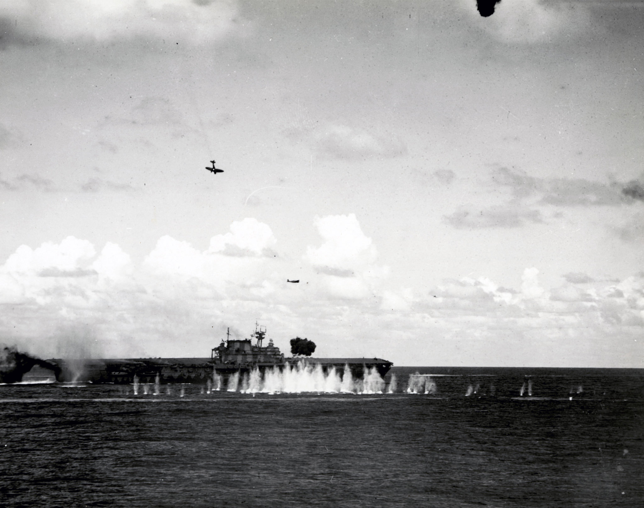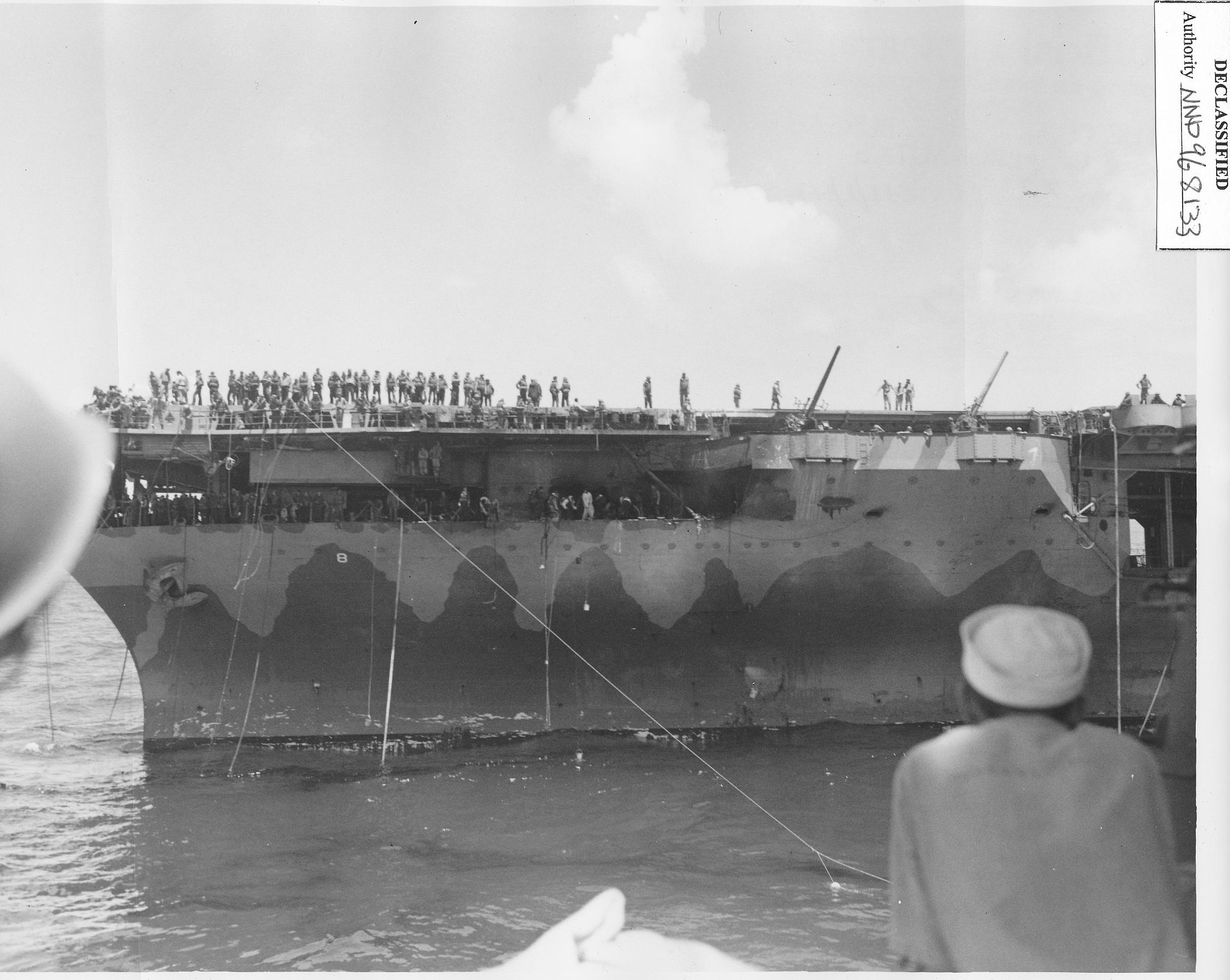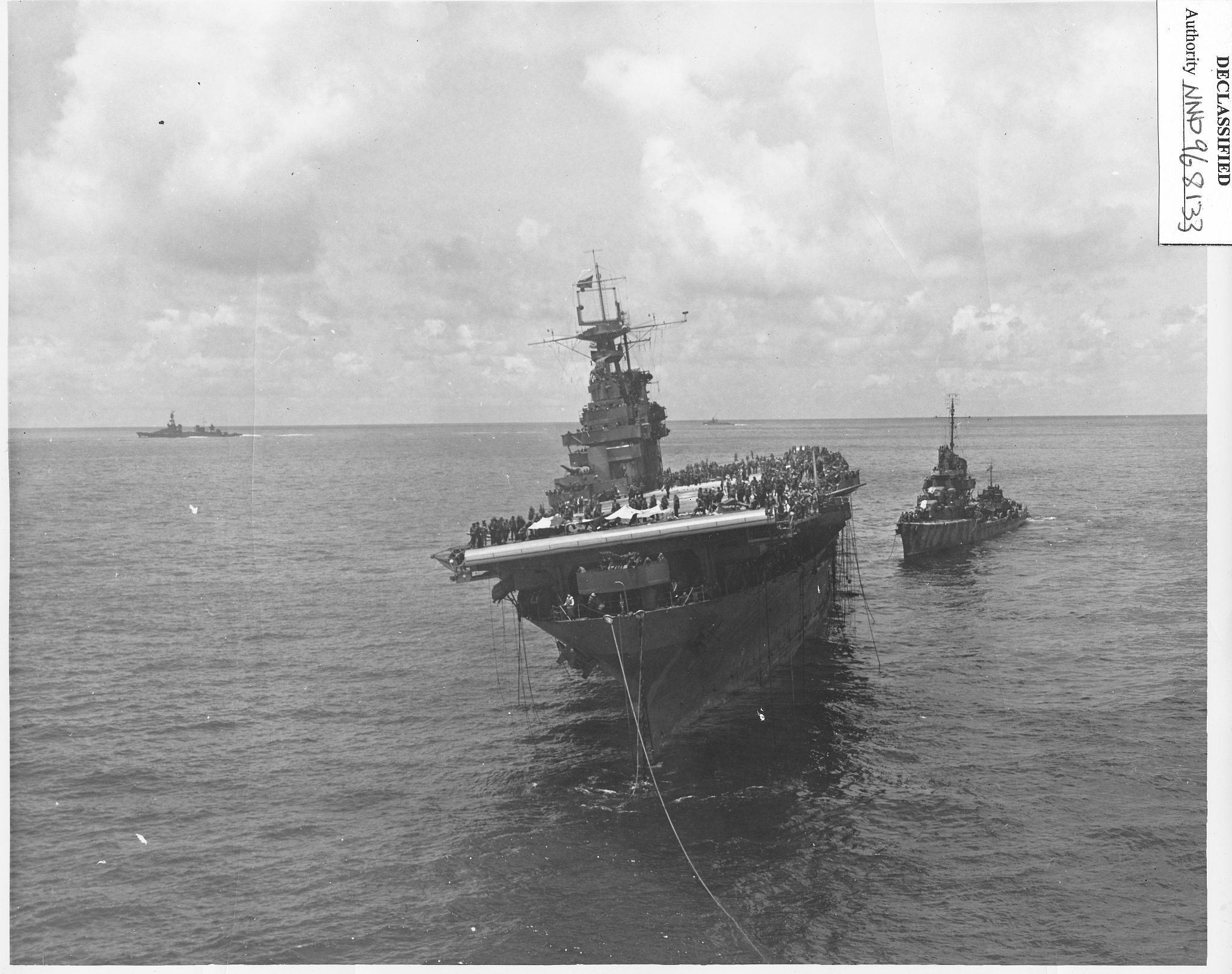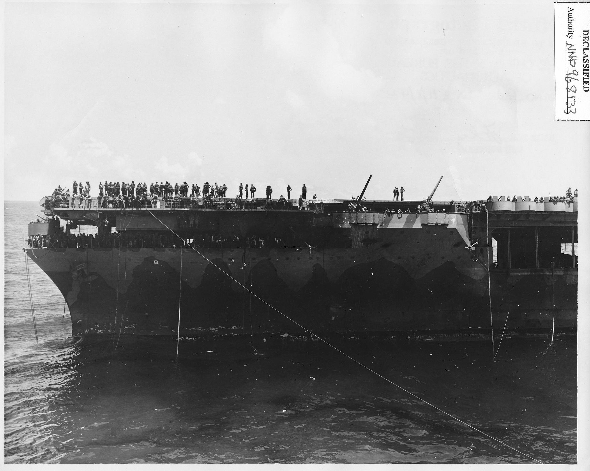 316k | October 26 1942, Hornet in tow. Cruiser Northampton (CA-26) made three attempts to take the carrier in tow, but additional Japanese attacks frustrated these efforts. The "X" above the bridge and the CXAM radar antenna indicates where T.R. Archer was wounded by a Japanese dive bomber in a suicide attack (see photos "020808" and "020809", above). |