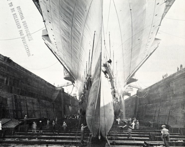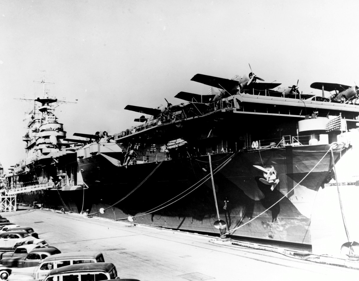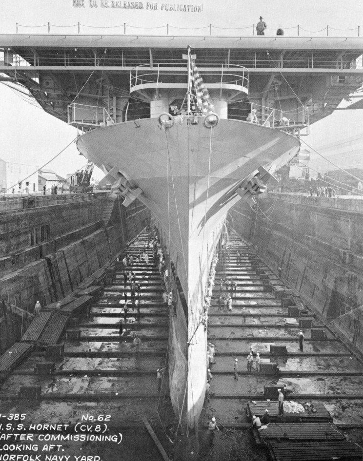 205k | USS Hornet (CV-8) in dry dock at the Norfolk Navy Yard, 19 November 1941, being inspected for any defects on her hull during her shakedown, a month after being commissioned into the U.S. Navy. |