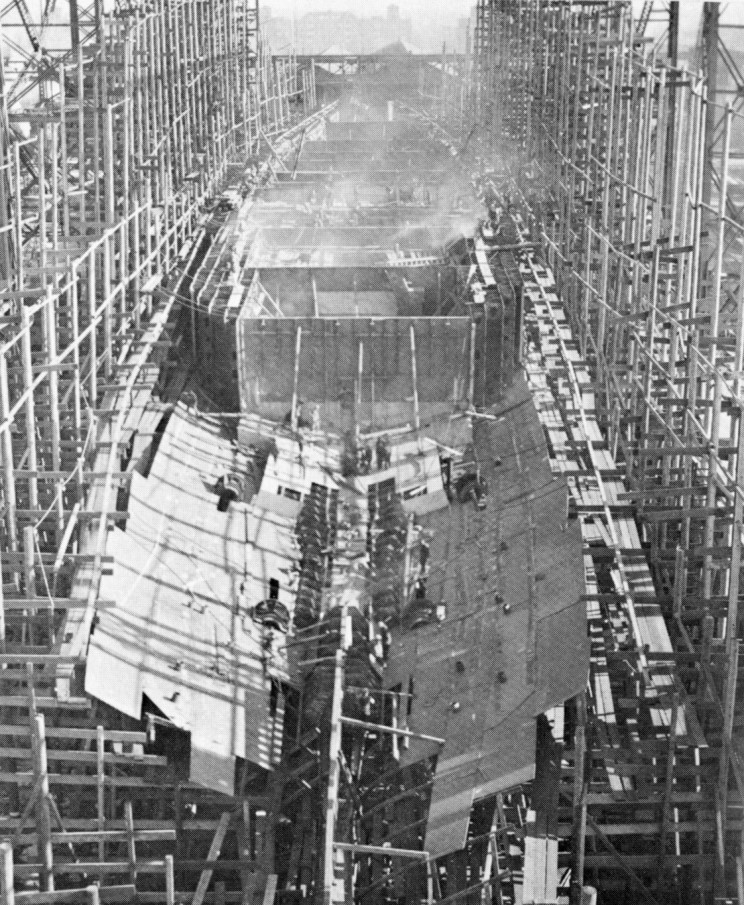 697k | The future USS Hornet (CV-8) under construction, looking forward, at Newport News Shipbuilding, Newport News, Virginia, 1 August 1940. National Archives and Records Administration (NARA) photo, # 19-LC-26335. |