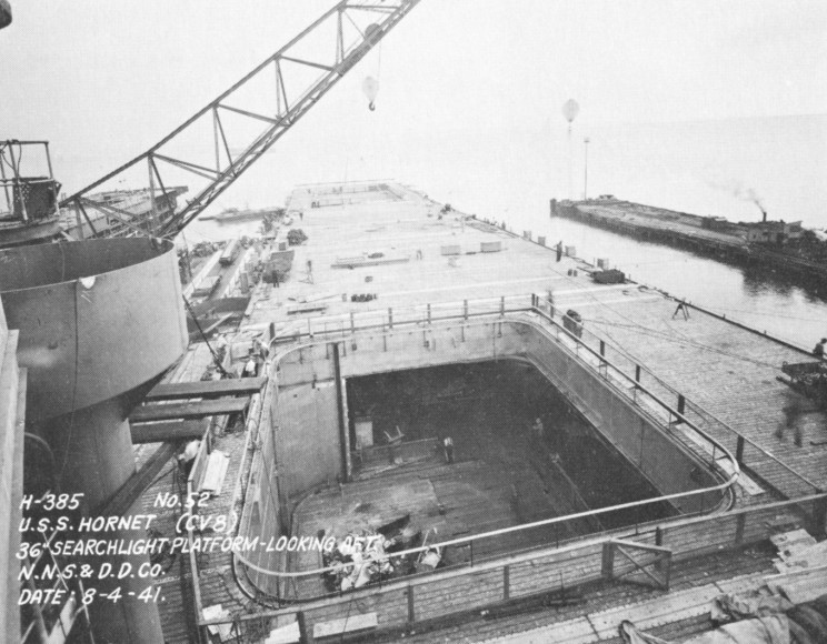 122k | Hornet (CV-8) under construction, 36" searchlight platform looking aft, Newport News & Dry Dock Co., 4 August 1941. |