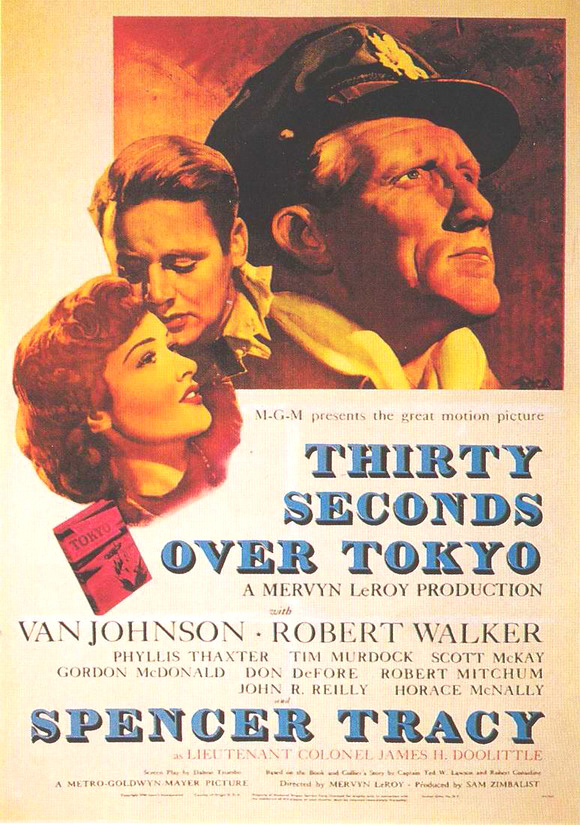 235k | Thirty Seconds Over Tokyo (MGM, 1944) is based on Lt Col James H. Doolittle's raid on Japan, in April 1942. The film, noted for its accurate depitcion of the historical details of the raid and its use of actual wartime footage of the bombers in some flying scenes, was directed by Mervyn LeRoy. The screenplay, by Dalton Trumbo, is based on the book (1943) of the same title by Capt Ted W. Lawson (a pilot who participated in the raid) and Robert Considine. The film stars Spencer Tracy as Lieutenant Colonel Doolittle, Van Johnson as Captain Lawson, Phyllis Thaxter as his wife, and Tim Murdock, Scott McKay, Gordon McDonald, Don DeFore, Robert Mitchum, John R. Reilly and Horace McNally. |