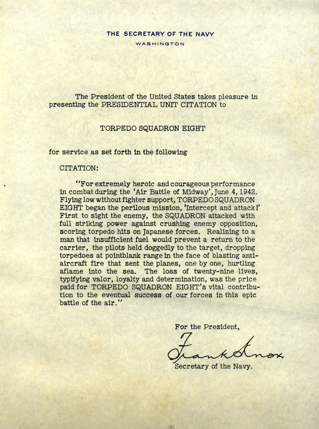 the Task Force 16 Citation by the Secretary of the Navy, Mr. John H. Dalton.