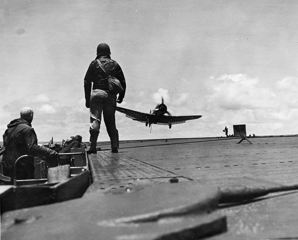 148k | Chief Parachute Rigger, Theo. R. Archer, USN, on flight deck of USS Hornet (CV-8), 1942. He was on her from commission till sunk. |