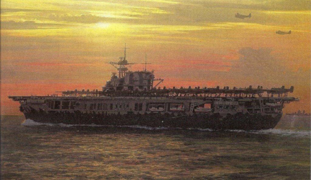 752k | Battle of Santa Cruz Islands, 26 October 1942. USS Hornet (CV-8) after the damage done by Japanese planes. Artwork by John Hamilton from his publication, War at Sea, pg. 159.