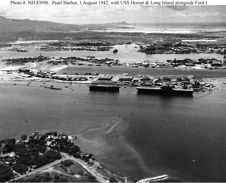 99k | USS Hornet (CV-8) photographed circa late 1941, soon after completion, probably at a U.S. east coast port. Note flight deck overhang and large crane stowed in the small boat area. A ferry boat and "Eagle Boat" (PE) are in the background. U.S. Naval Historical Center Photograph (# NH 81313). |