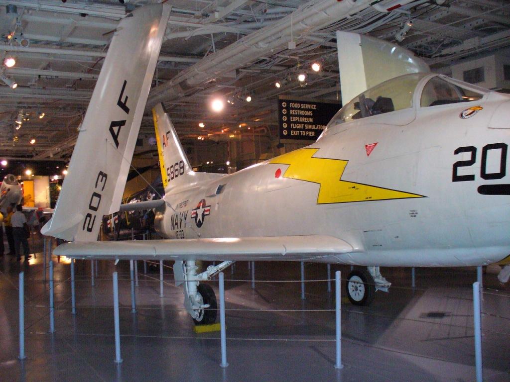 126k | North American FJ-3 Fury, USN, BuNo 135868. This Fury is painted in the colors of Fighter Squadron (VF) 33 "Tarsiers," which flew from USS Intrepid in 1957. |
