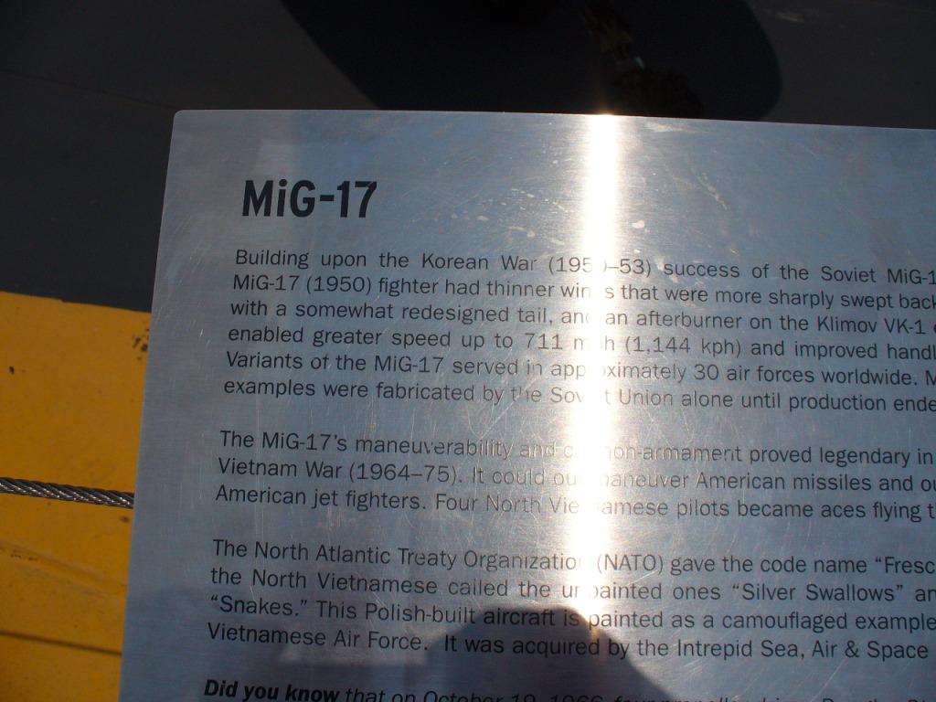 105k | Plaque for the Polish-built, Soviet MiG-17F (NATO code: Fresco), painted in the colors of the North Vietnam Air Force. |