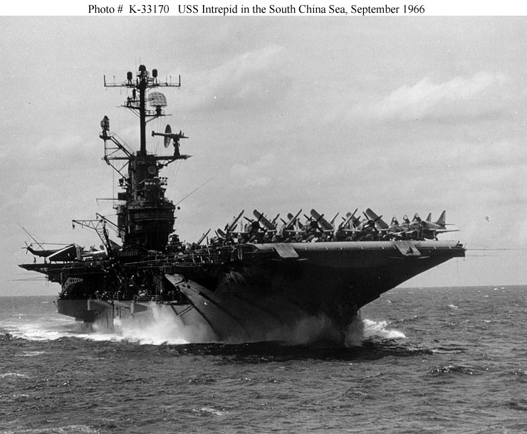 81k | USS Intrepid (CVS-11) steaming in the South China Sea, with her attack air group parked on the flight deck, 13 September 1966. Photographed by V.O. McColley. Official U.S. Navy Photograph (# K-33170). |