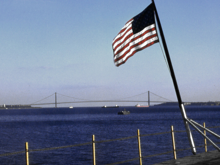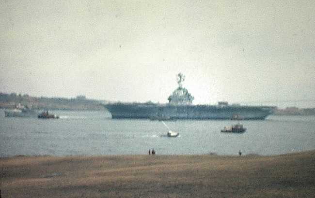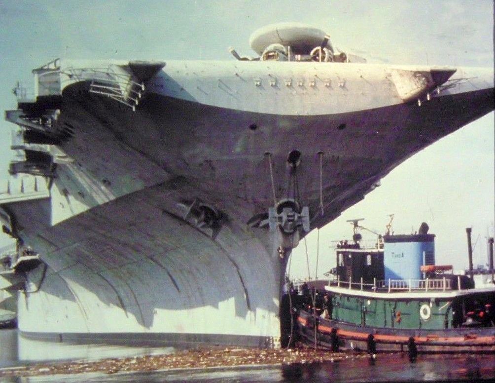 155k | This photo may have been taken around noon on Sunday, 12 September 1965. USS Intrepid (CVS-11) moved from the New York Naval Shipyard, Brooklyn, New York, to Naval Supply Center, Bayonne, New Jersey, to complete her FRAM (Fleet Rehabilitation and Modernization) overhaul. Verrazzano-Narrows Bridge (at the time spelled Verrazano, with a single "z") is in the distance. |