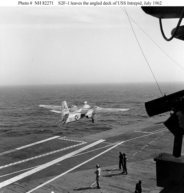 75k | Grumman S2F-1 Tracker Anti-Submarine Aircraft (Bureau # 136502) leaving the angled deck of USS Intrepid (CVS-11) in July 1962. Note vapor trails made by its propellers. This plane belongs to squadron VS-27. Official U.S. Navy Photograph, from the collections of the Naval Historical Center (photo # NH 82271). |