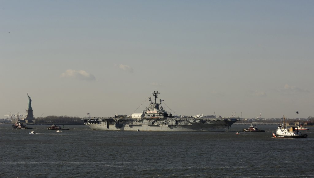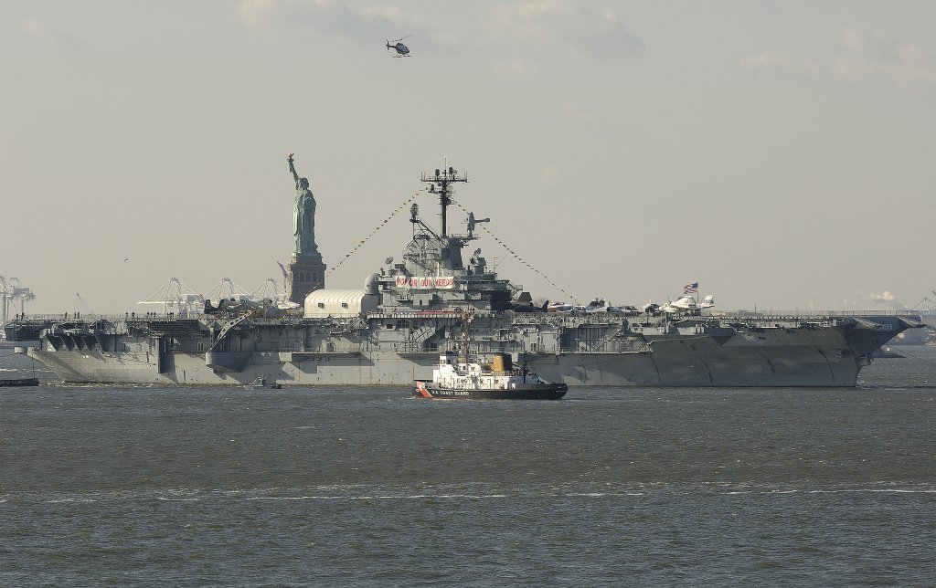 300k | Intrepid returning from Homeport Pier, Staten Island, to her home at Pier 86, Manhattan, 2 October 2008. |
