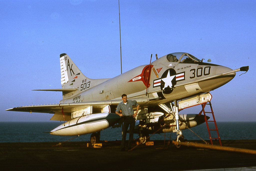 115k | Bill Messer with A-4B Skyhawk BuNo 145013, of VA-15 "Valions." Note this plane was assigned to Carrier Air Wing (CVW) 10's CAG, then CDR Tom B. Hayward, who in later years was CO of USS Graffias (AF-29), 1967–8; USS America (CVA-66), 1969–70; Commander, U.S. Seventh Fleet, 1975–6; Commander in Chief, U.S. Pacific Fleet, 1976–8; and the 21st Chief of Naval Operations, 1978–82. BuNo 145013 was subsequently sold to the Republic of Singapore and converted to an A-4S. |