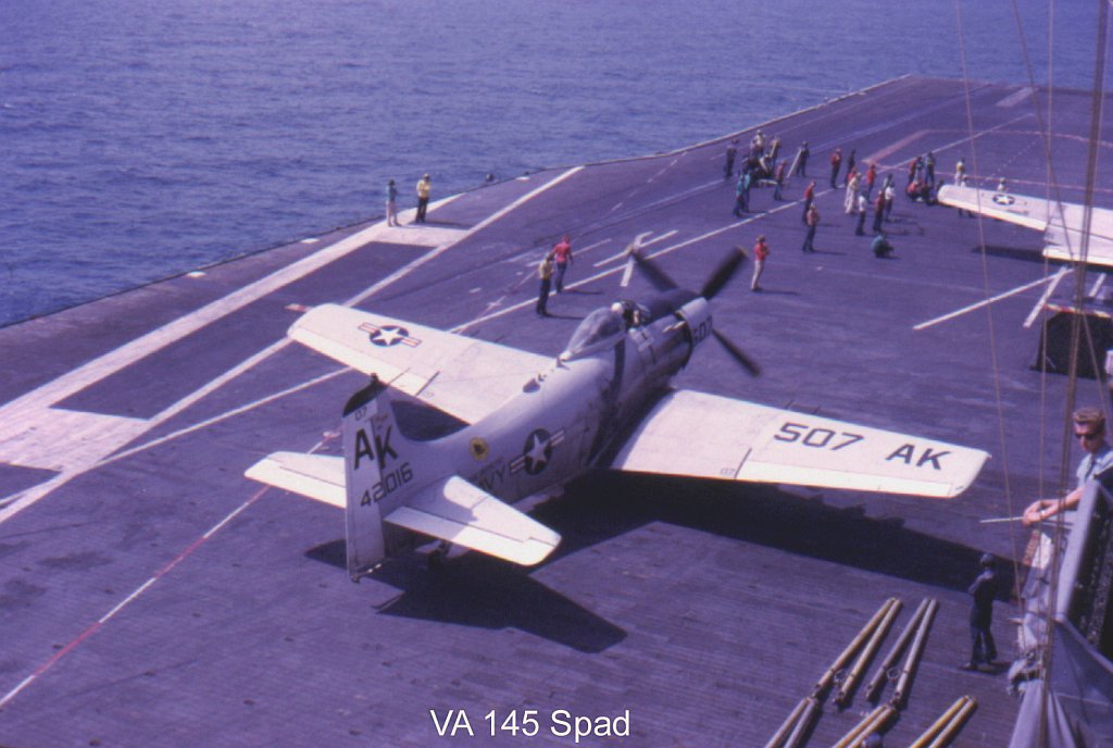 143k | A-1 Skyraider of VA-165 "Boomers". Note plane guard destroyer in the background. |