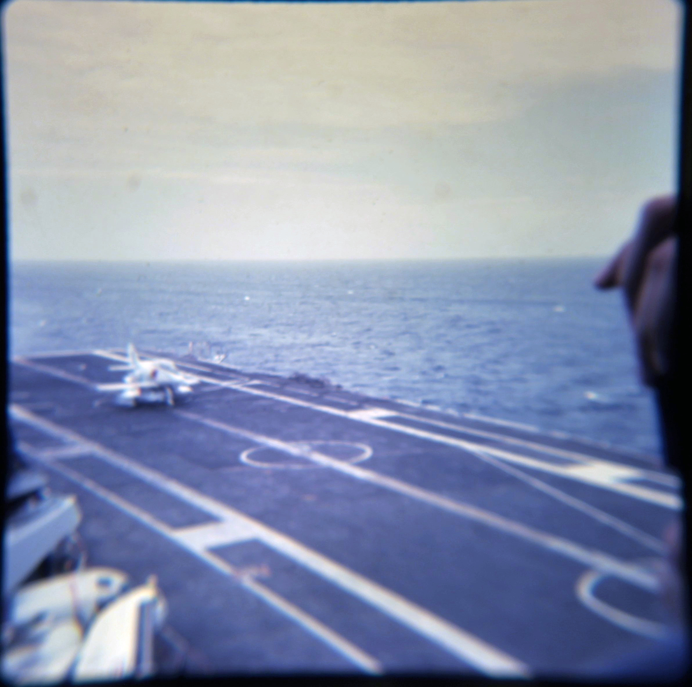 473k | USS Intrepid (CVS-11) recovering an A-4 Skyhawk, Mediterranean Sea, 23 May 1967. As seen from USS Fred T. Berry (DD-858). |