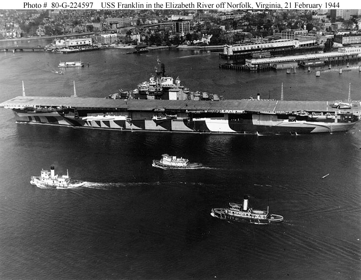 586k | USS Franklin (CV-13) in the Elizabeth River, off Norfolk, Virginia, 21 February 1944. National Naval Aviation Museum photo, R.L. Lawson Photograph Collection, via David Stubblebine. |