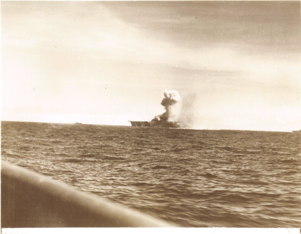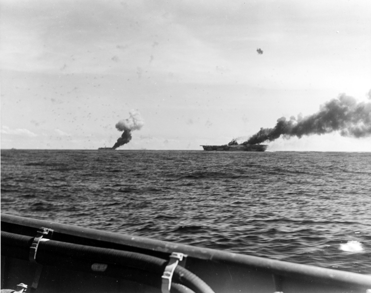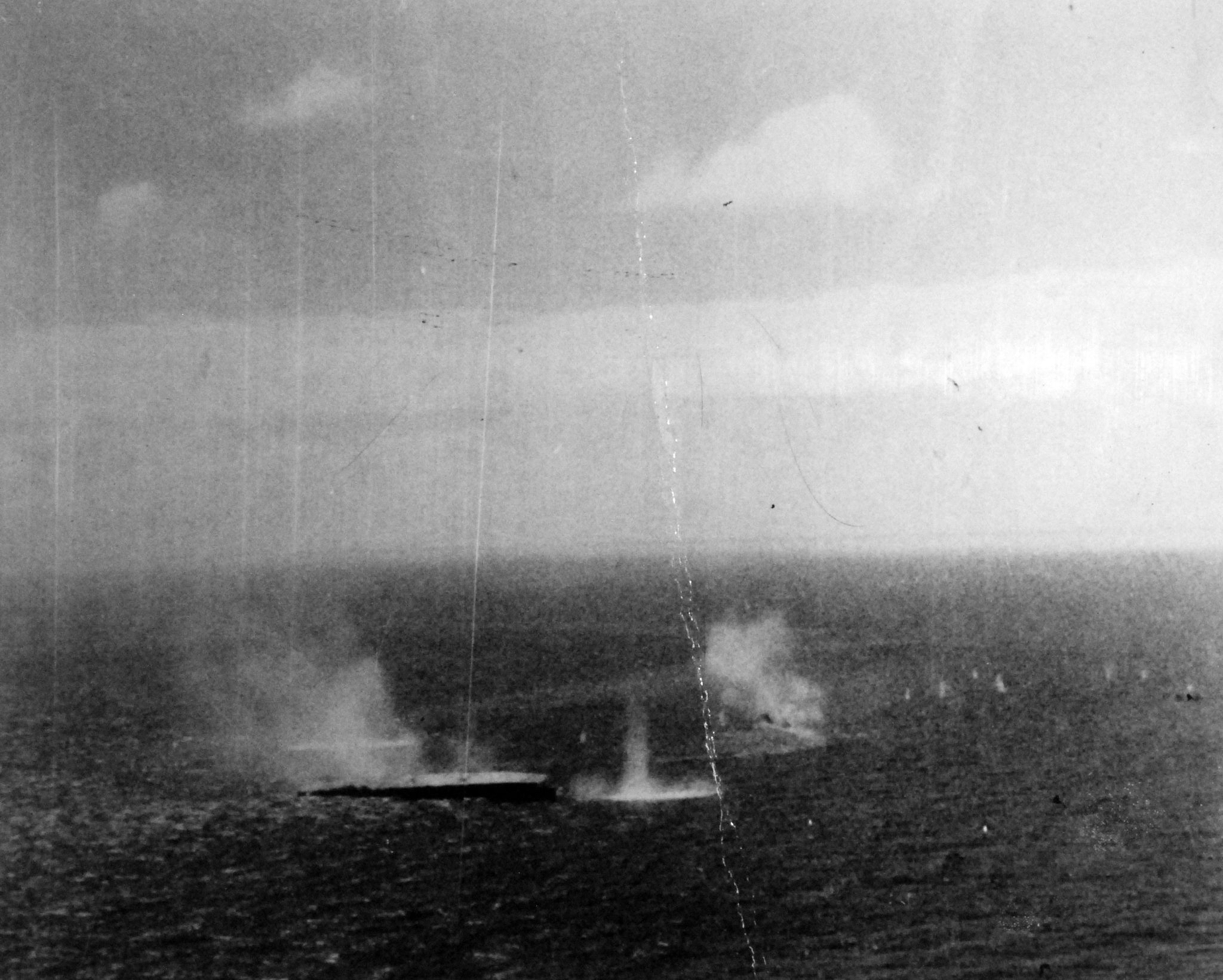 392k | Battle of the Sibuyan Sea. Japanese warships under attack by carrier-based planes. Note the light aircraft carrier, Zuiho, listing in the water. Taken from a plane from USS Franklin (CV-13), 24 October 1944. National Archives and Records Administration (NARA) photo, # 80-G-272553. |