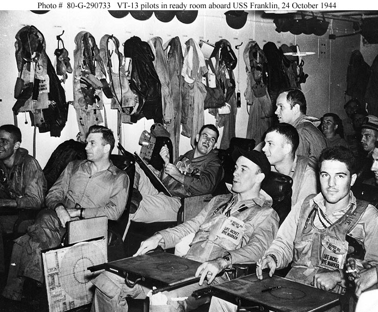 138k | Pilots of Torpedo Squadron (VT) 13 in their ready room aboard USS Franklin (CV-13), 24 October 1944, just before the Battle of the Sibuyan Sea. They are watching as the position of the Japanese fleet is posted. VT-13's Commanding Officer, Lieutenant Commander Larry French, is second from the left, with a navigation board beside his chair. Note life vests, with die marker pouches, worn by several of these men. Other life vests, and .38 caliber revolvers, are hanging on the bulkhead. Official U.S. Navy Photograph, now in the collections of the National Archives and Records Administration (NARA), # 80-G-290733. |
