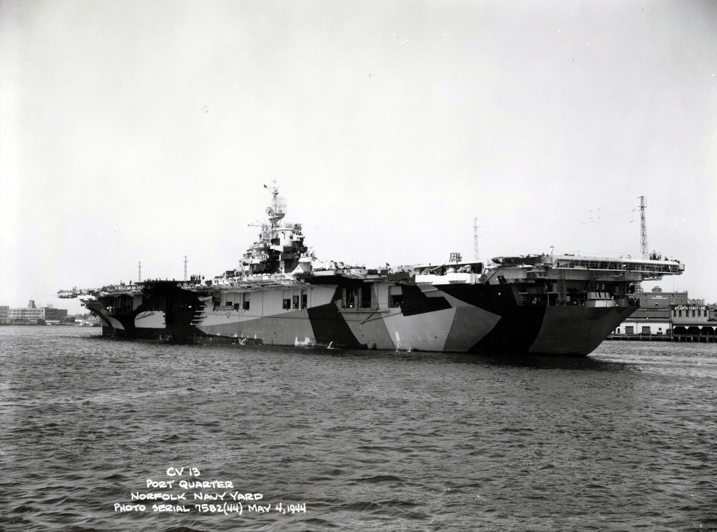 575k | USS Franklin (CV-13) in the Elizabeth River, off Norfolk, Virginia, 21 February 1944. National Naval Aviation Museum photo, R.L. Lawson Photograph Collection, via David Stubblebine. |