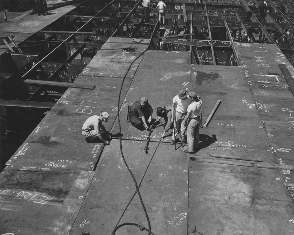 121k | Construction workers at Newport News Shipbuilding pull sections of Franklin's second deck into careful alignment before welding in May 1943. US Navy photo now in the 80-G collection at NARA College Park (# 80-G-474223). |
