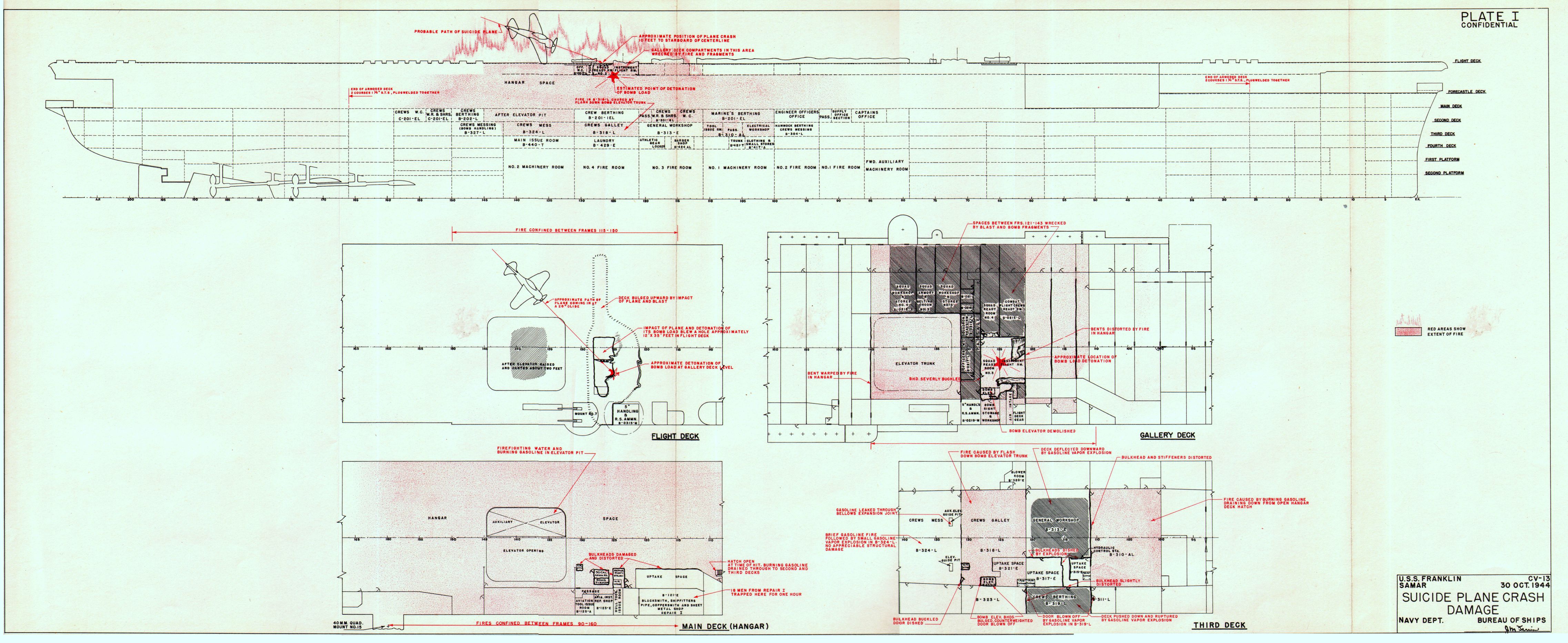 1.25M | USS Franklin (CV-13), Suicide Plane Crash Damage, Samar, 30 October 1944. Navy Dept., Bureau of Ships, War Loss/Damage Report No. 56, United States Navy. |