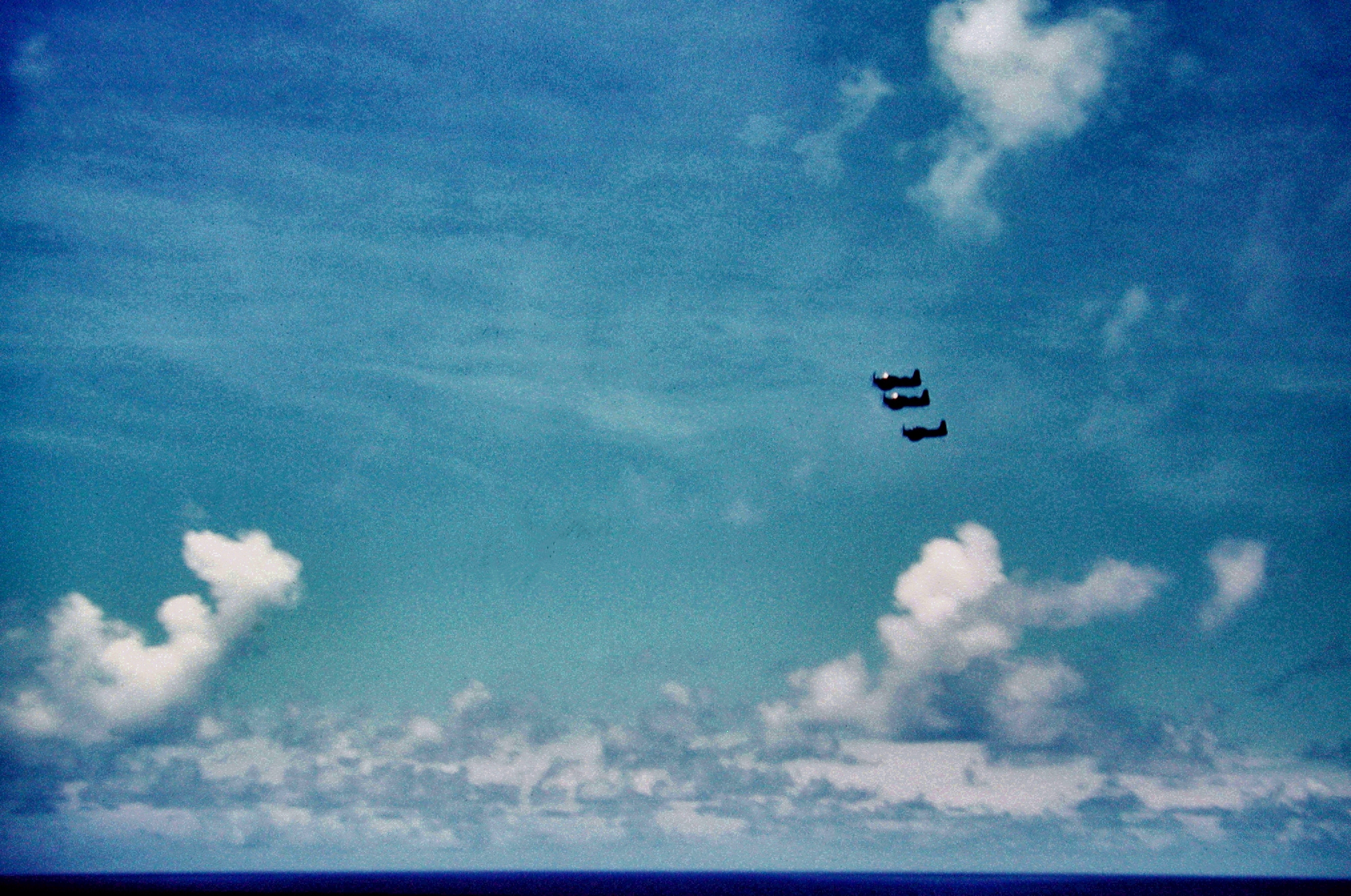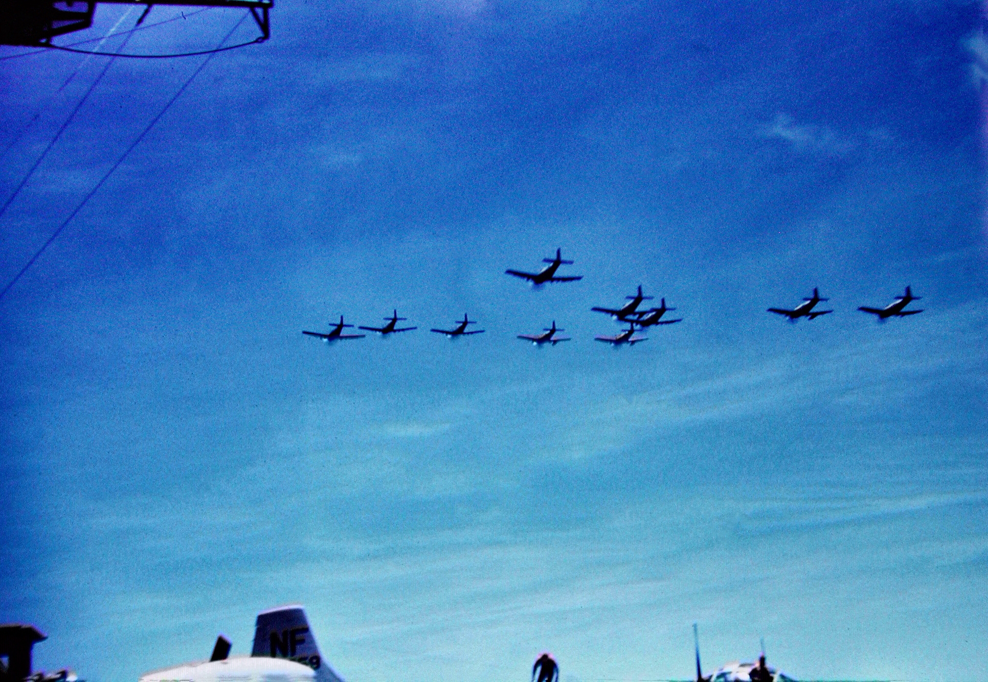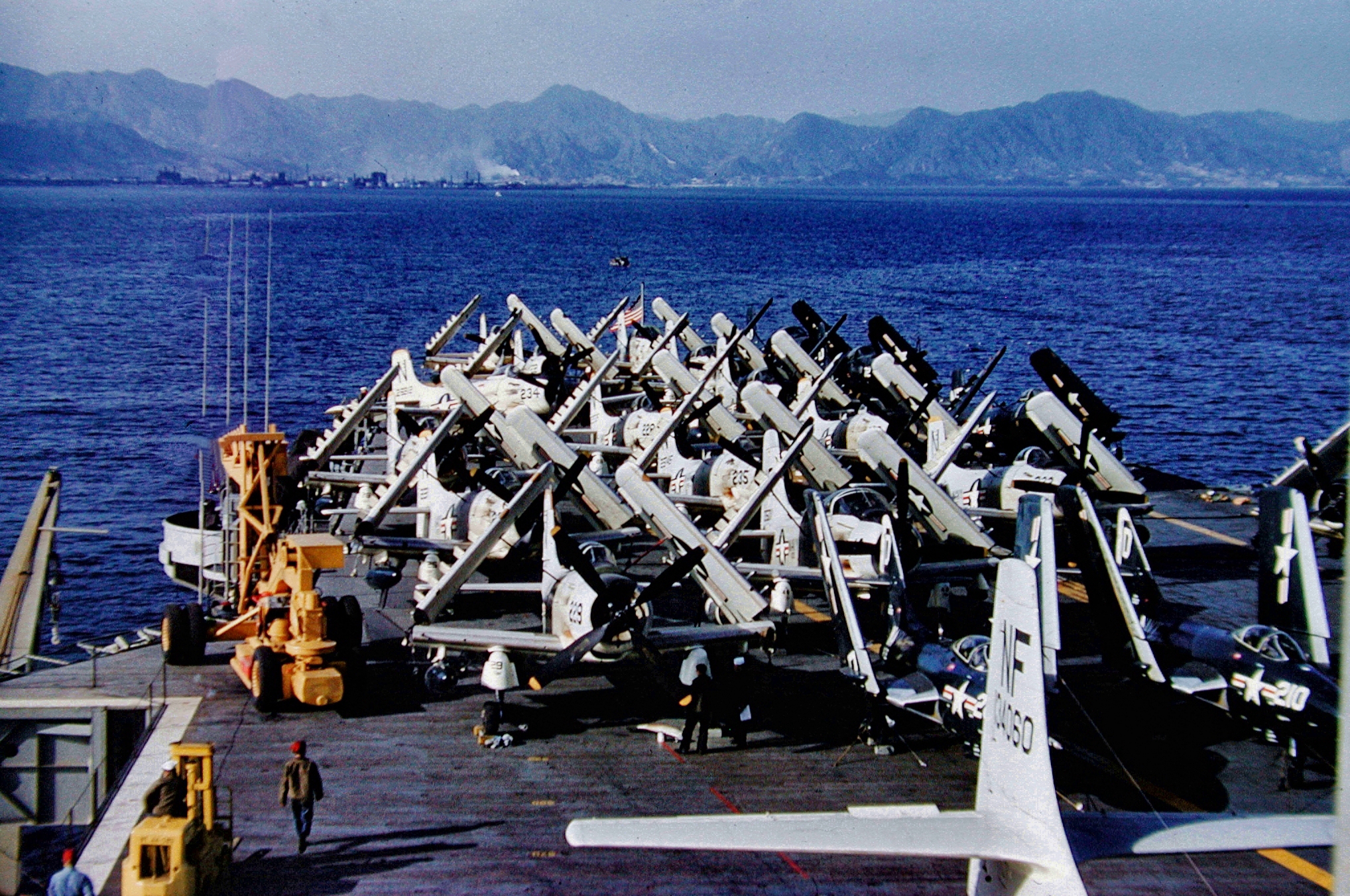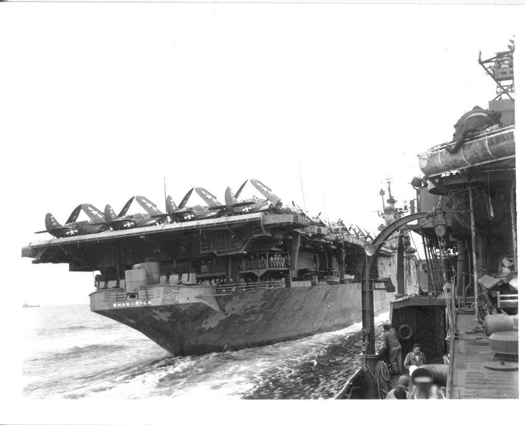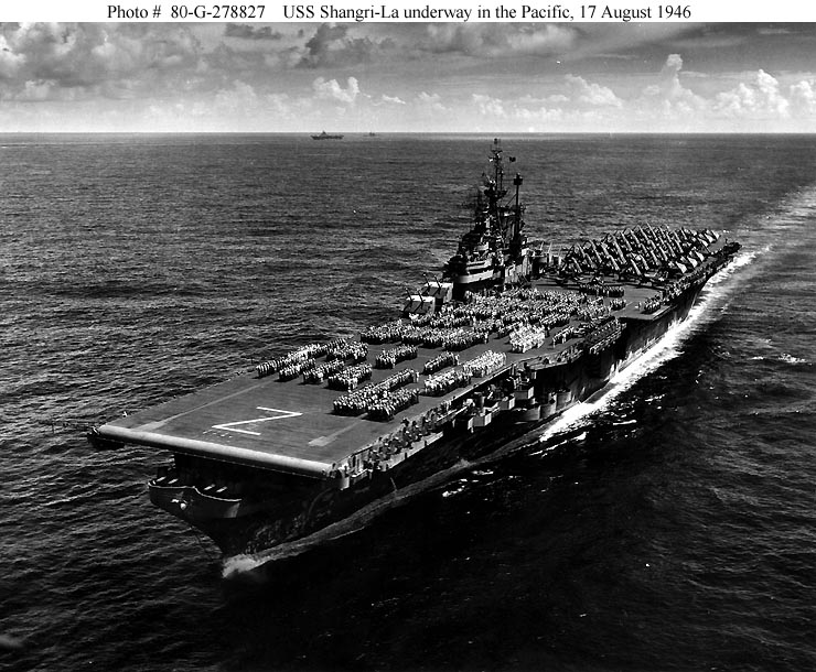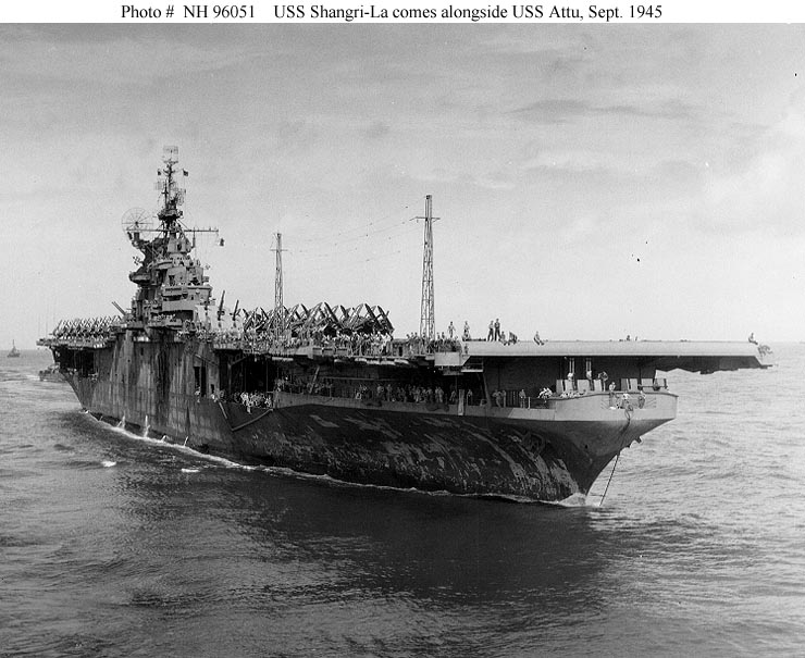 95k | Taken at Trinidad, B.W.I., sometime between November 26 and December 16, 1944, during her shakedown cruise. At this time Shangri-La was camouflaged in Ms.33, Design 10A; she was repainted in Ms. 21 in February 1945, in the Pearl Harbor Navy Yard. (Thanks to Bob Ketenheim, Historian, USS Shangri-La Association, who provided additional info). | Timm Smith | |||||||||||||