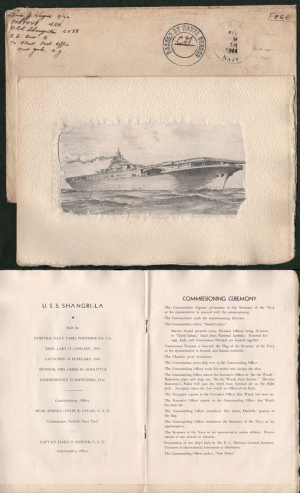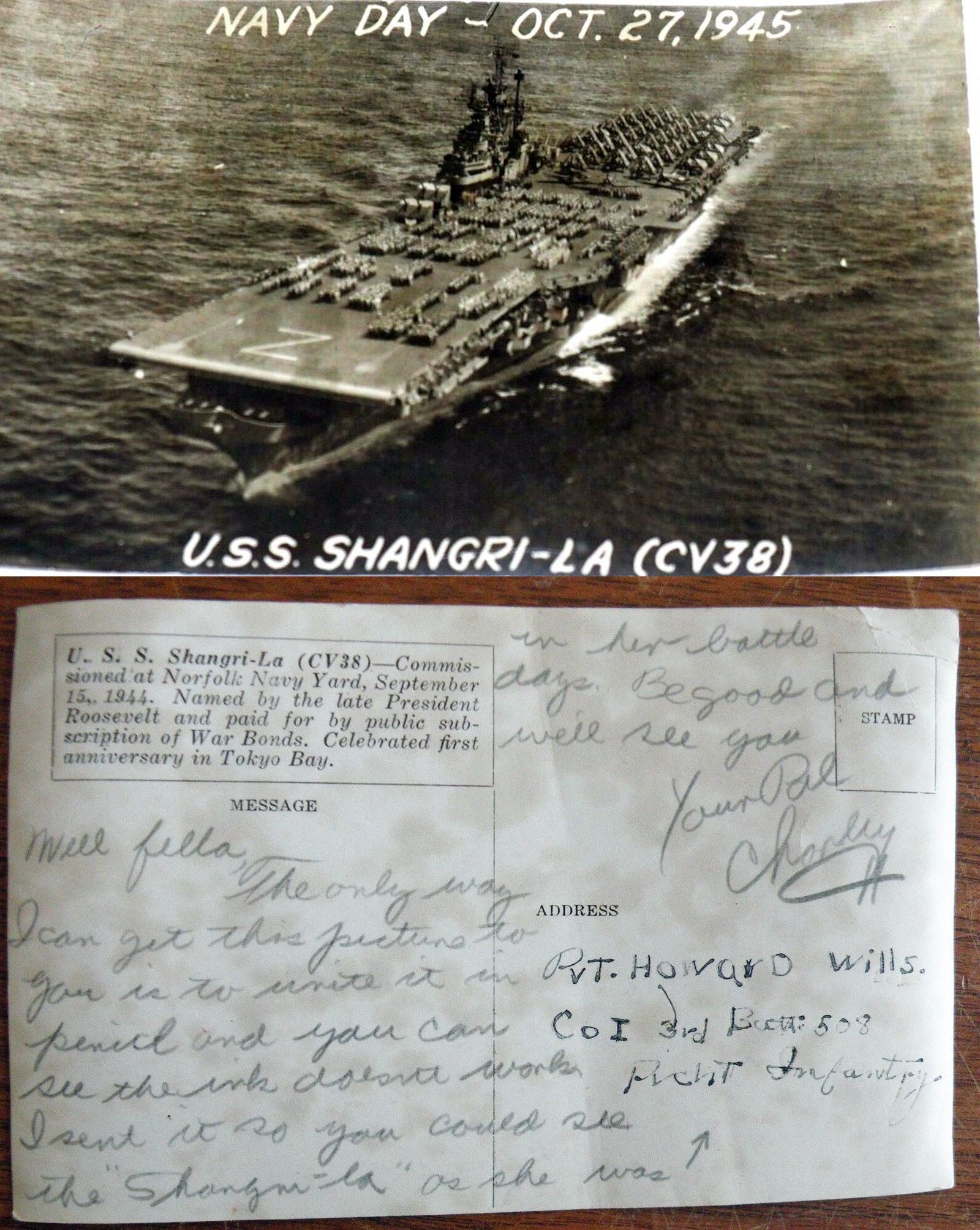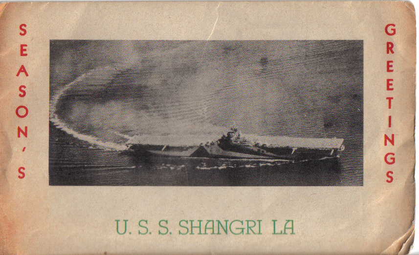 540k | Photo NS023805 as a postcard. "Navy Day — Oct. 27, 1945 / USS Shangri-La (CV-38)" "U.S.S. Shangri-La (CV-38)—Commissioned at Norfolk Navy Yard, September 15, 1944. Named by the late President Roosevelt and paid for by public subscription of War Bonds. Celebrated first anniversary in Tokyo Bay." |
