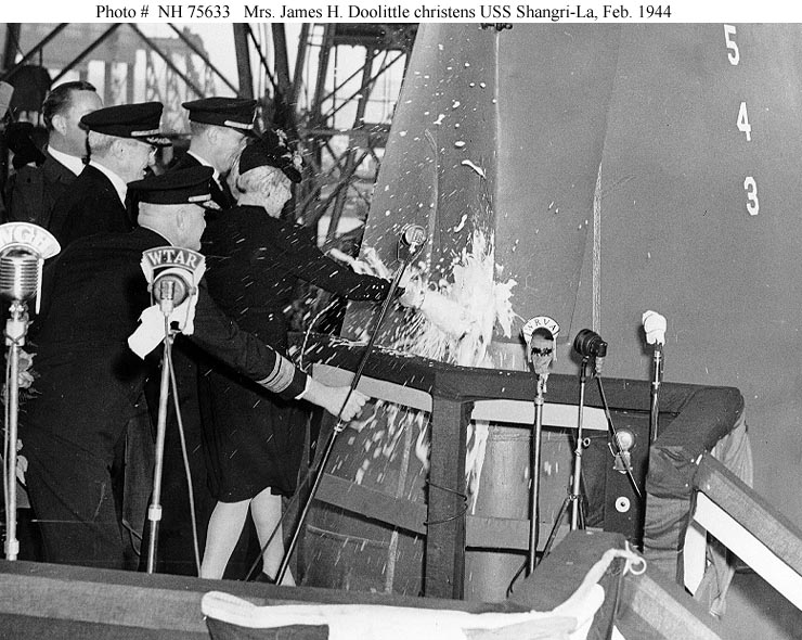 111k | USS Shangri-La (CV-38) is christened by Mrs. James H. Doolittle, during launching ceremonies at the Norfolk Navy Yard, Virginia, 24 February 1944. Rear Admiral Felix X. Gygax, the Navy Yard Commandant, is in the foreground, holding a microphone close to the sponsor's champagne bottle as it smashes into the new carrier's bow. U.S. Naval Historical Center Photograph (# NH 75633), courtesy of James Russell. |
