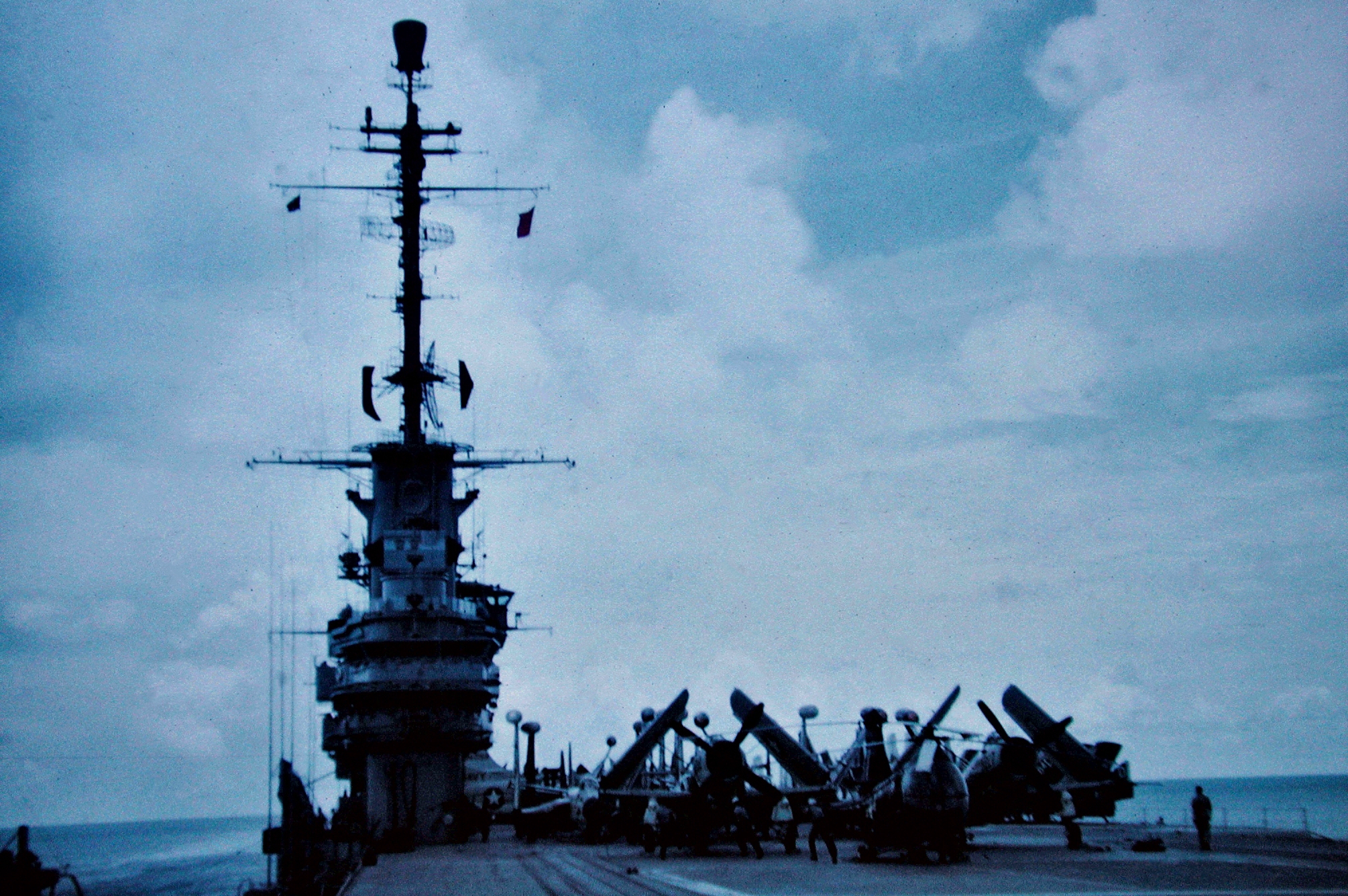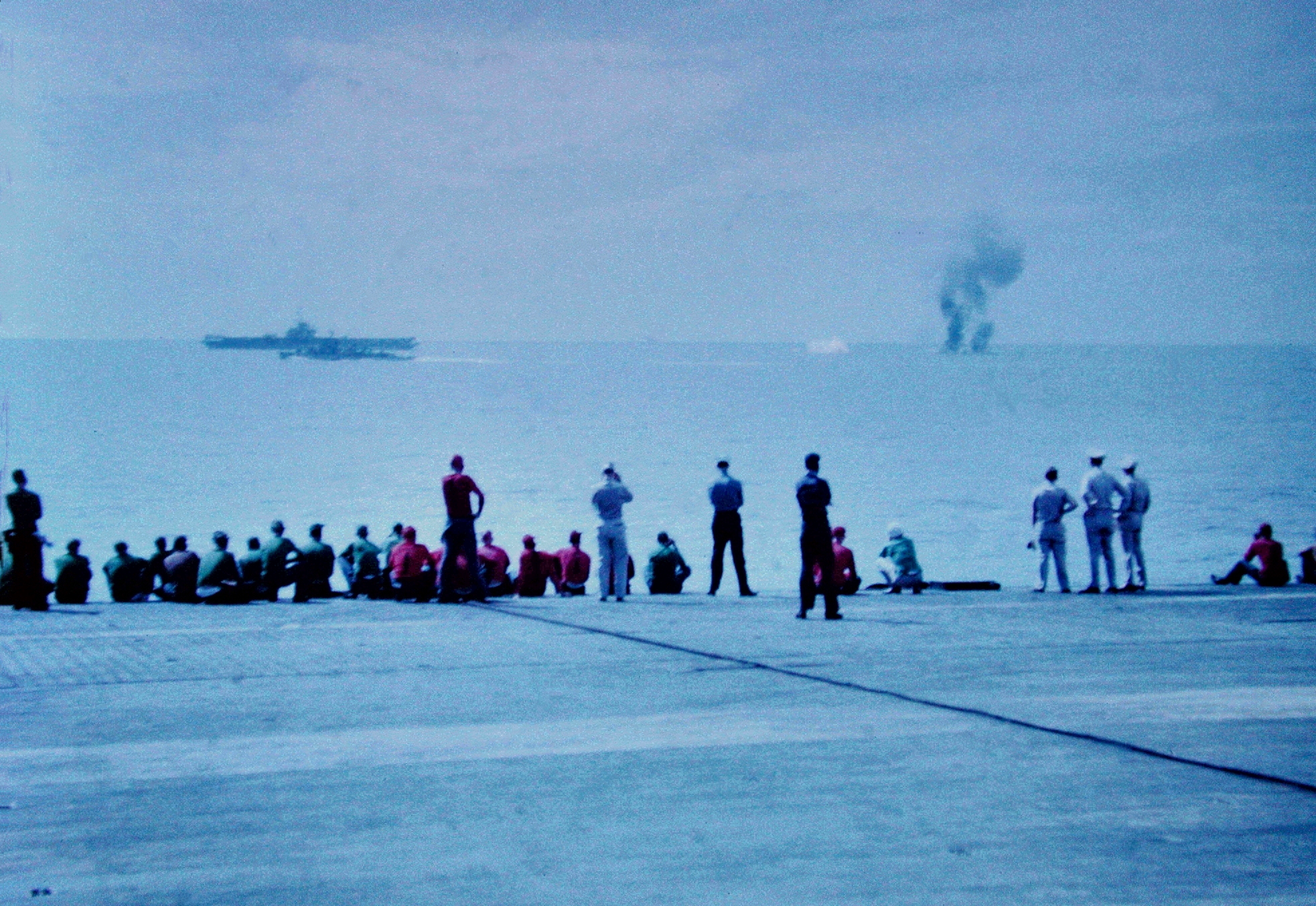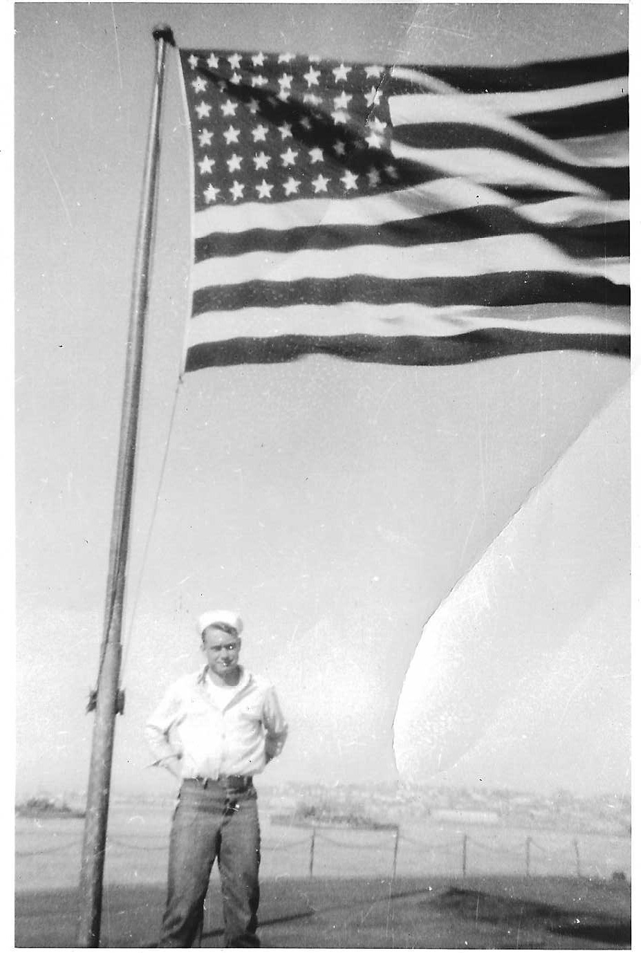74k | Sherwood Smith, plankowner, on the island, at the base of the tripod. San Diego, November 1945. | Timm Smith, son of Sherwood Smith | |||||||||||||