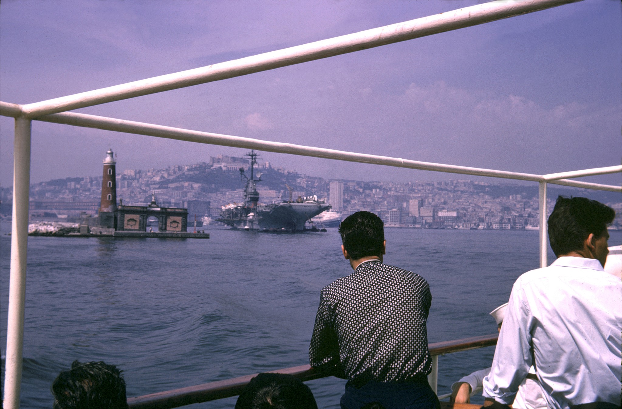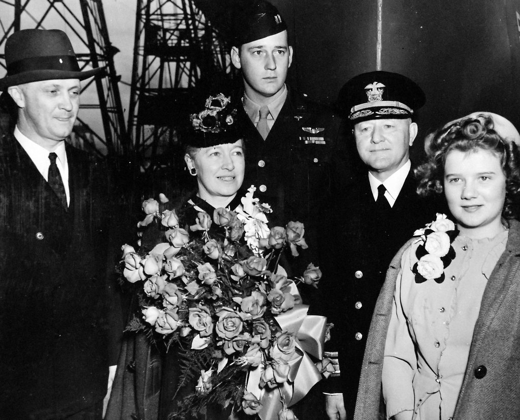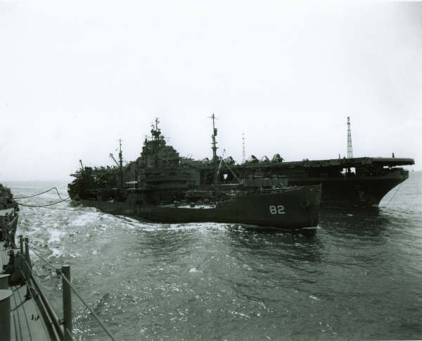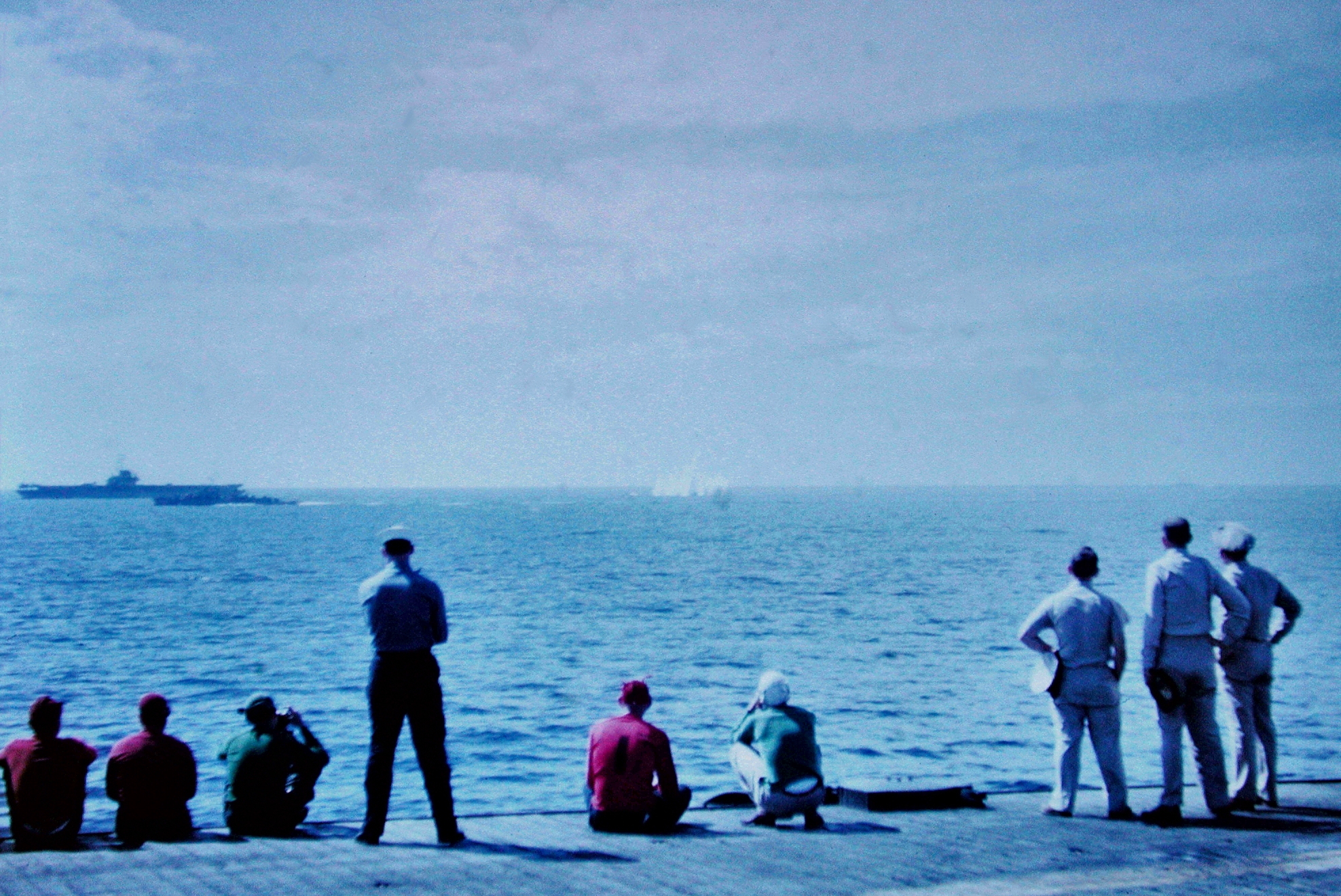 74k | Sherwood Smith, plankowner, on the island, at the base of the tripod. San Diego, November 1945. | Timm Smith, son of Sherwood Smith | |||||||||||||