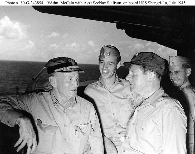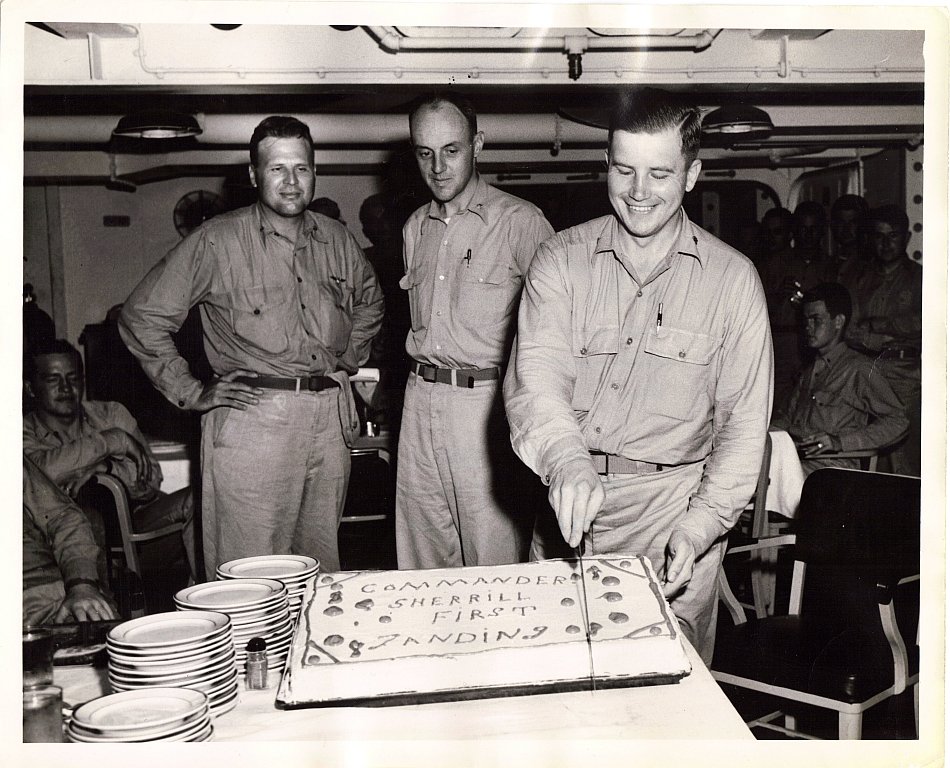159k | "On October 15, [1944 ...] At precisely 11:32:15, Cdr. Wallace Sherrill, Commander Air Group Eighty-Five, piloting a TBM-3 Avenger, Buno. 23085, made the first landing aboard Shangri-La. Aboard the torpedo bomber as passengers were Lt. Cdr. C. W. Dougherty and Lt. McDowell." The photo, taken in the Wardroom, shows the celebration of the first landing. The man cutting the cake is CDR Sherrill; CDR J. F. Wigelius, Air Boss, is standing on the left; CDR Joseph F. Quilter, XO, is standing in the middle. (Information from Bob Ketenheim, Historian, USS Shangri-La Association. Quote from his book, "USS Shangri-La History," page 14.) Official Navy photograph, # CV-38-221-12-12-1944. |